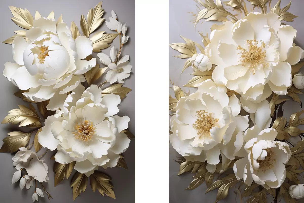 Schilderij Grote witte pioenrozen met gele bladeren tegen een grijze achtergrond Art. m30327