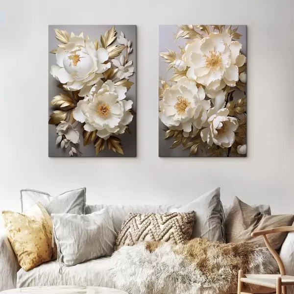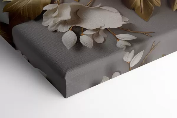 Schilderijen Grote witte pioenrozen met gele bladeren tegen een grijze achtergrond m30327