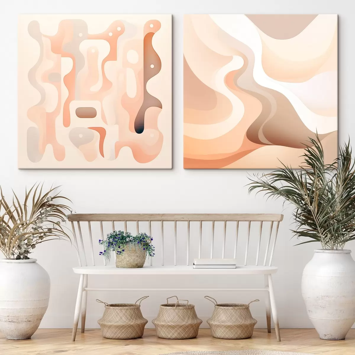 Schilderij Abstracte compositie met vloeiende lijnen en volumineuze vormen in een beige-bruin kleurenpalet Art. m30349