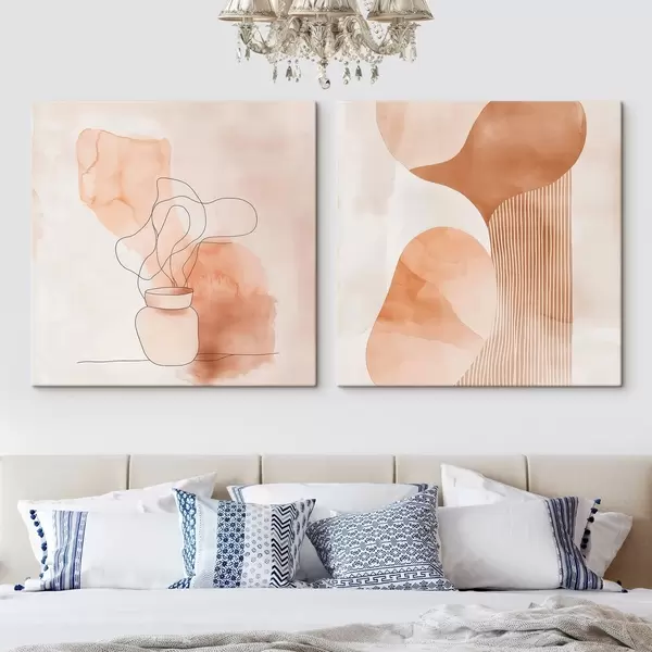 Schilderijen Abstracte vormen in een beige-perzikkleurig palet met lineaire accenten in een minimalistische stijl m30361