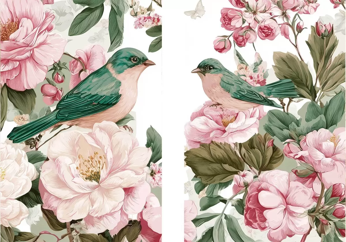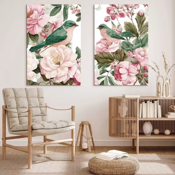 Schilderijen Vogels op zachtroze bloemen m30386