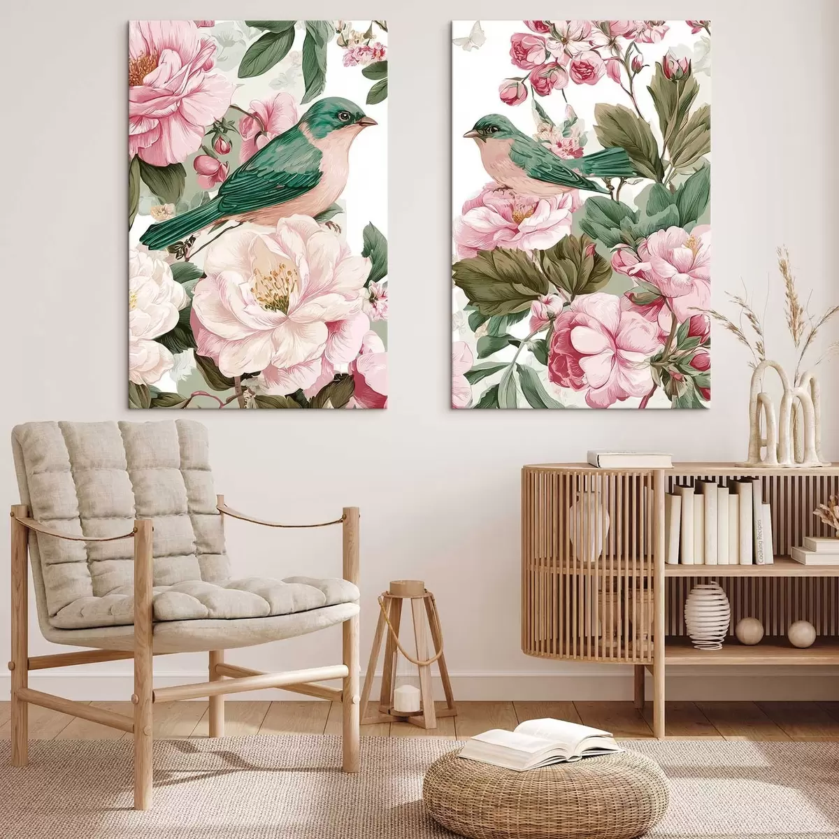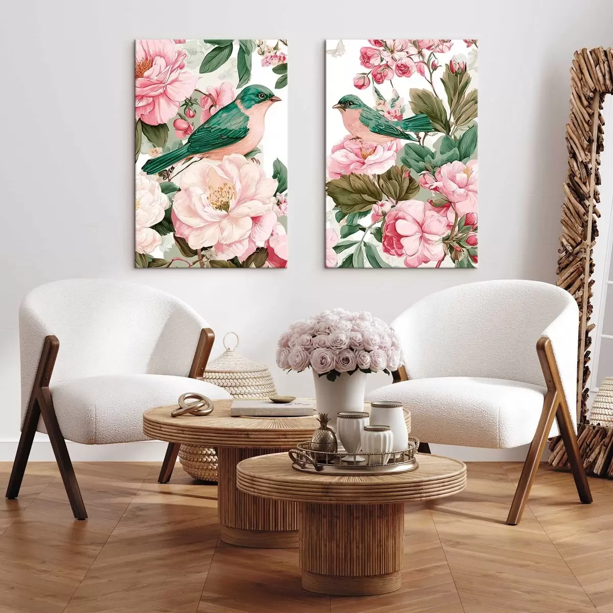 Schilderij Vogels op zachtroze bloemen Art. m30386