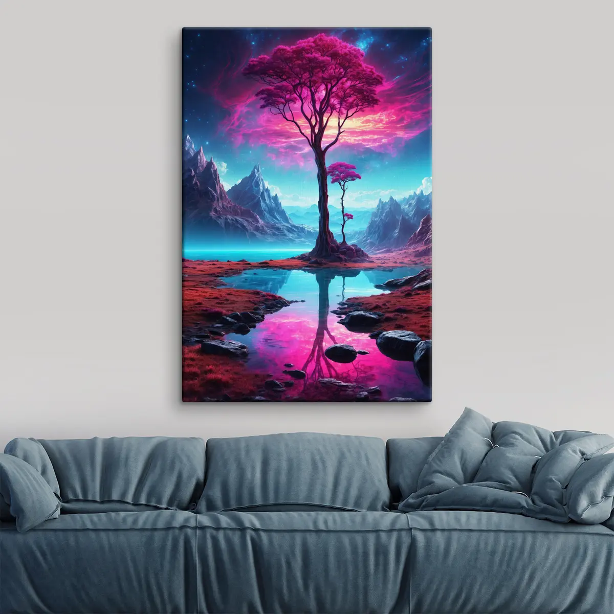 Schilderijen Een boom tegen een achtergrond van bergen en een fantastische lucht s36445