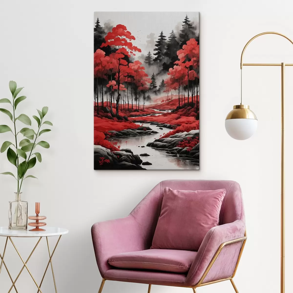 Schilderij Zwart en rood bos in aquarel Art. s37122