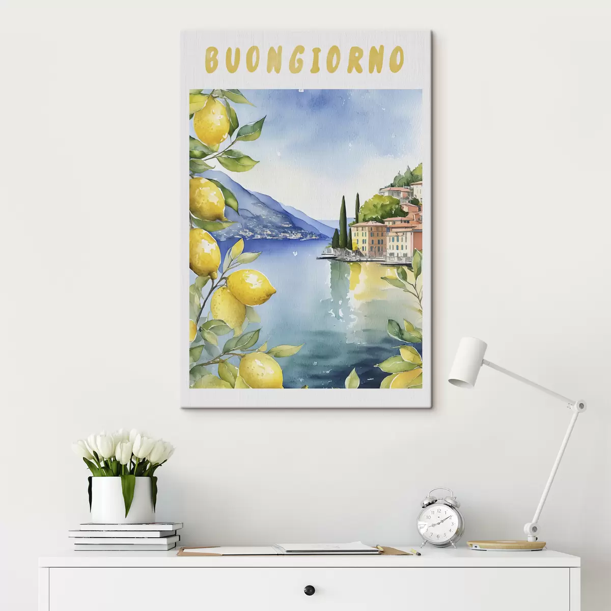 Schilderij Italiaans meer, zomer, aquarel, natuurlandschap, citroenen, stadsarchitectuur Art. s38394