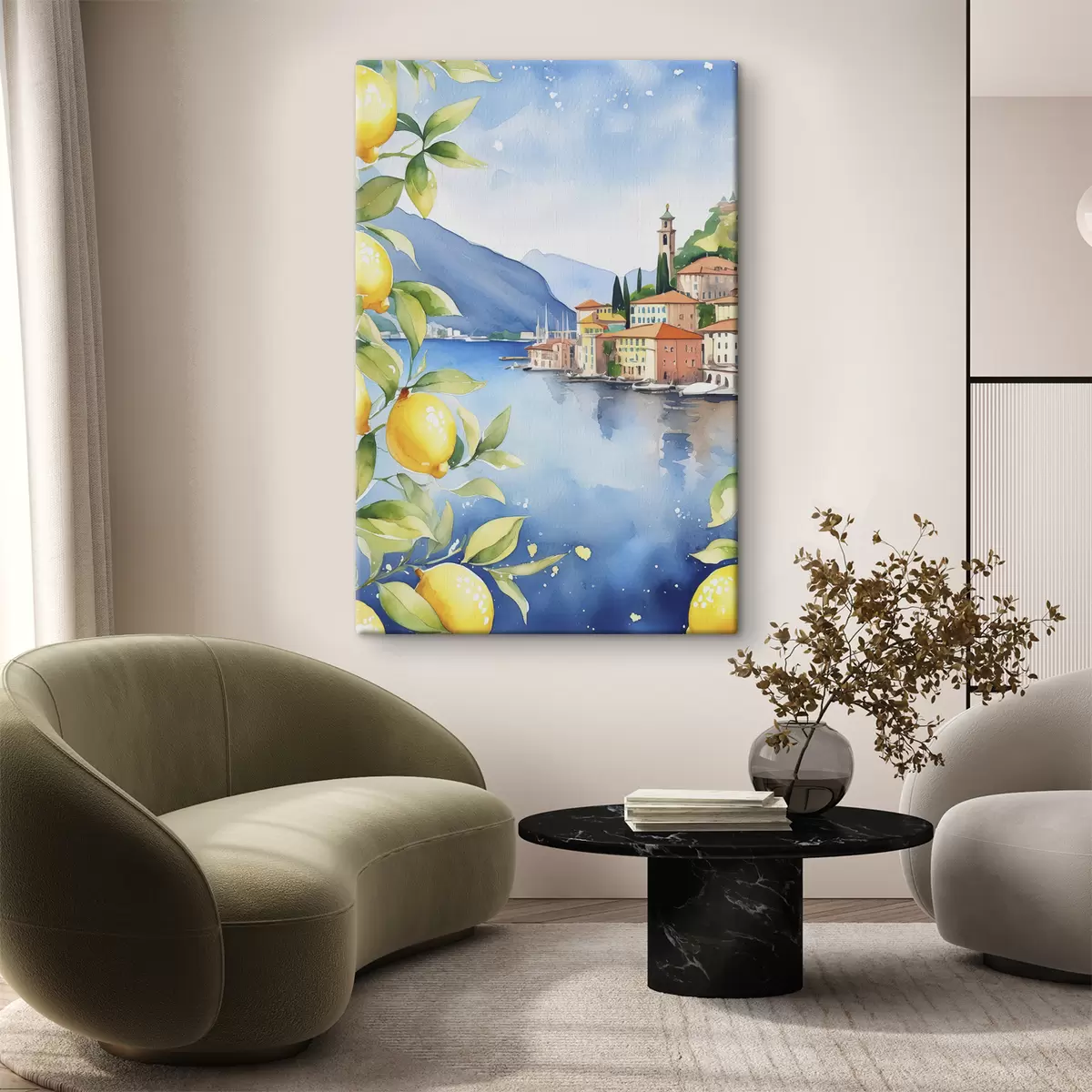 Schilderij Italiaans meer, zomer, aquarel, natuurlandschap, citroenen, stadsarchitectuur Art. s38397