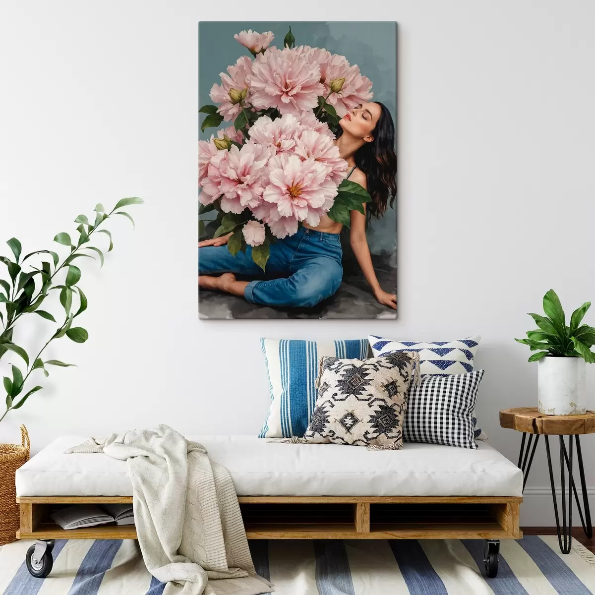 Schilderijen Een vrouw op de grond met een groot boeket bloemen s38595