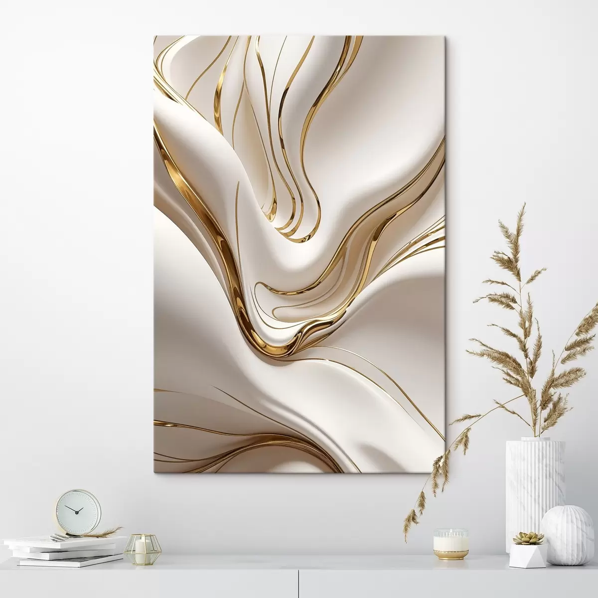 Schilderij Vloeiende witte abstracte vormen, die lijken op vloeibaar of gesmolten metaal, dynamische compositie Art. s38767