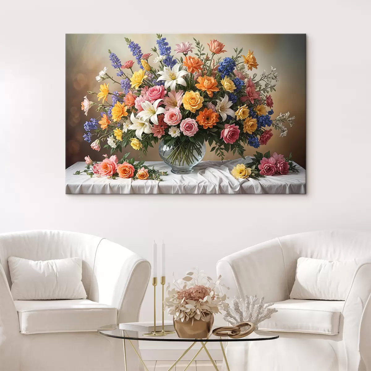 Schilderij Een levendig boeket van verschillende kleurrijke bloemen in een glazen vaas op een wit tafelkleed, kunstschilderij vintage Art. s38825