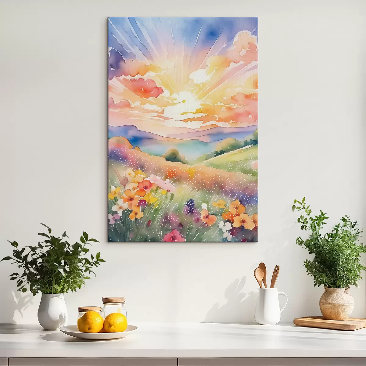 Schilderij Zonsondergang in het zomerveld, bloemen, zon, kleurrijke lucht, wolken, natuur Art. s38842