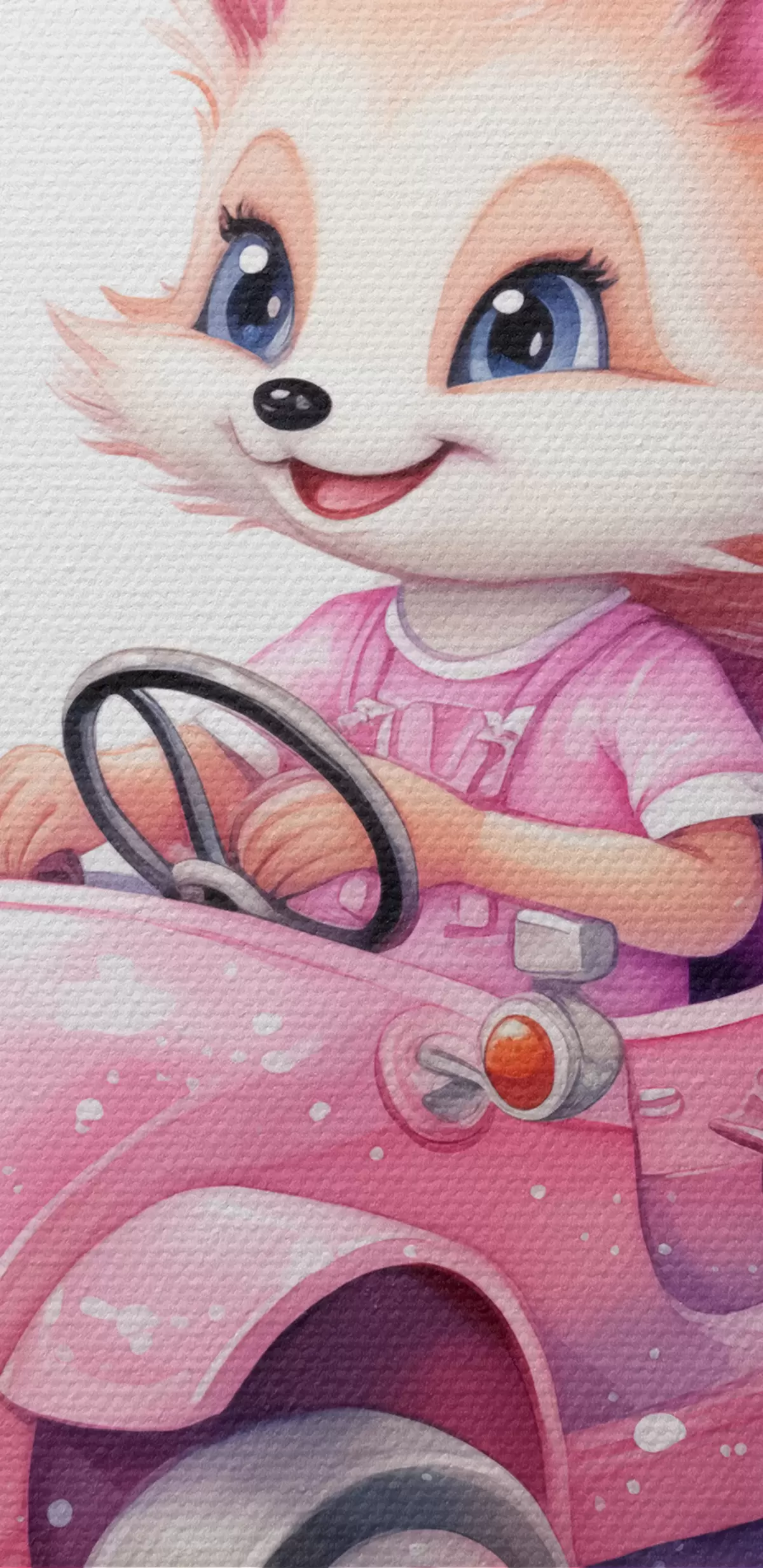 Schilderij Kleine vos rijdt in een roze auto kinder aquarel illustratie Art. s38943