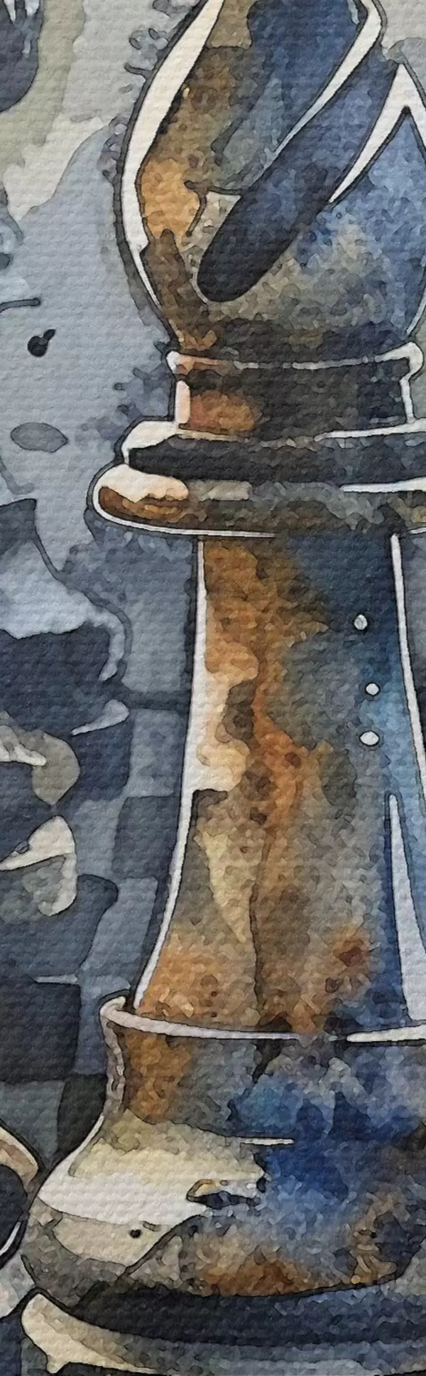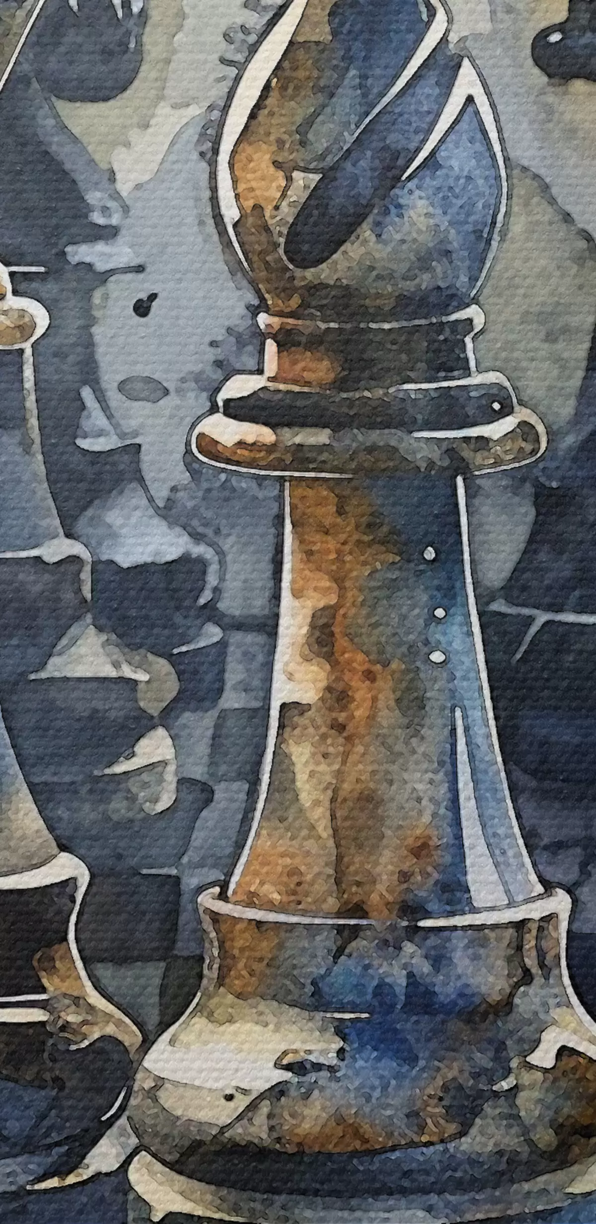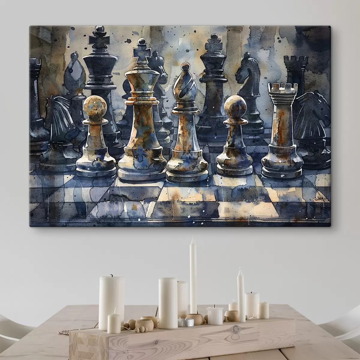 Schilderij Close-up van een aquarelschilderij van een schaakspel gemaakt van metaal of steen, met gedetailleerde ontwerpen en texturen Art. s38960