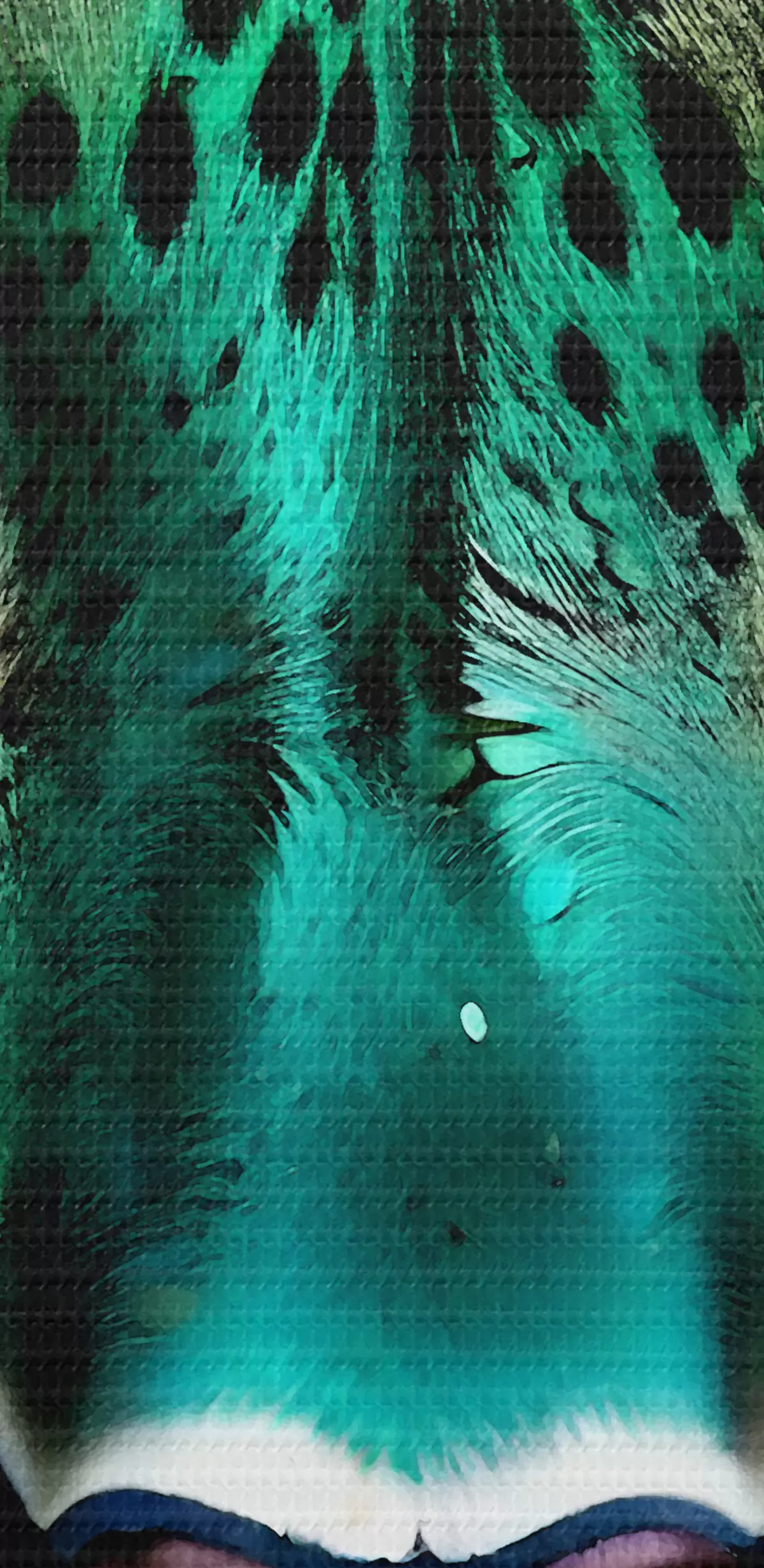 Schilderijen Een close-upportret van een fel groenogig luipaard met levendige turkoois en zwart gevlekte vacht s38979