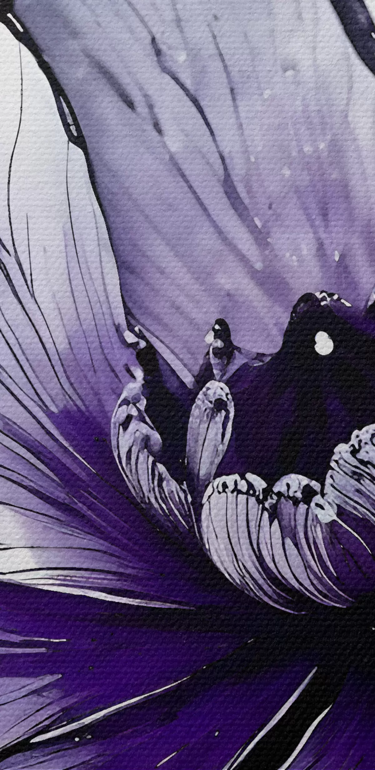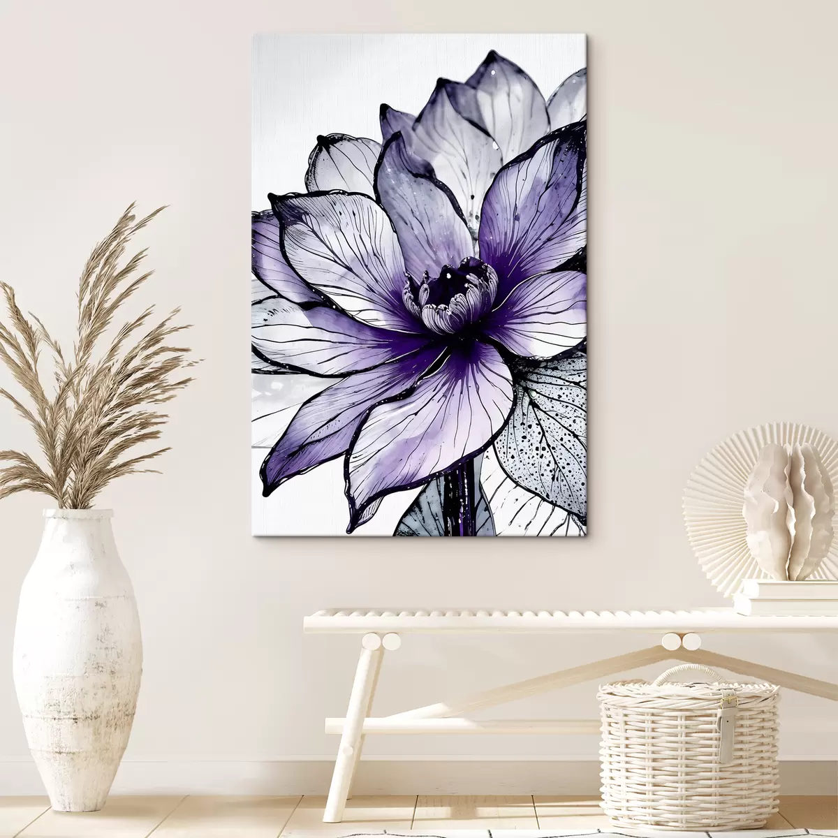 Schilderij Een grote, levendige paarse bloem met delicate, ingewikkelde bloemblaadjes tegen een donkere achtergrond Art. s38982