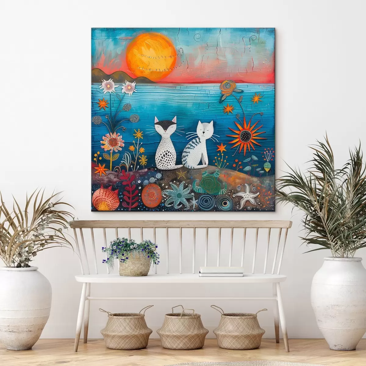 Schilderij Katten bij zonsondergang, kleurrijke bloemen Art. s39085