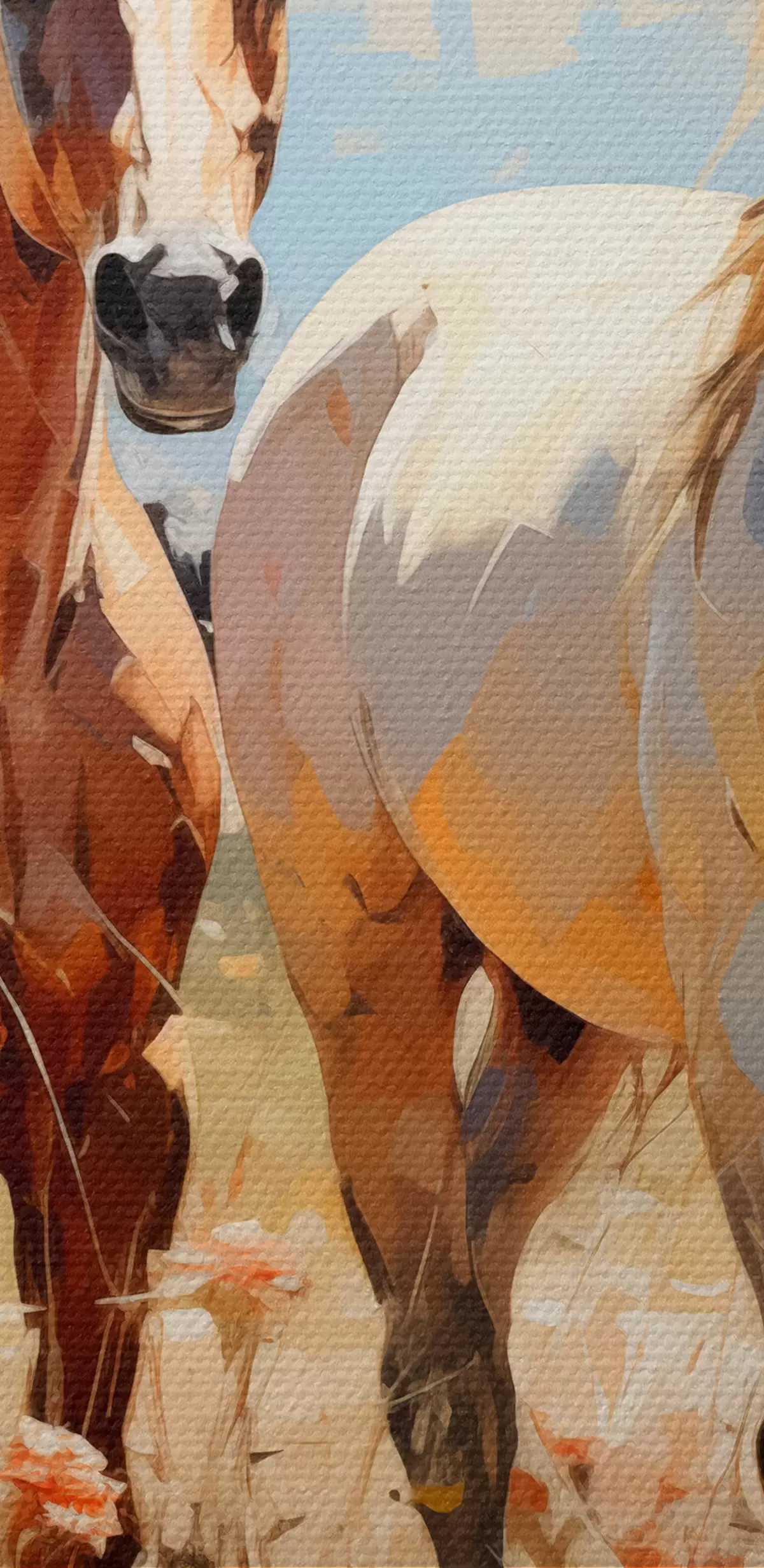 Schilderijen Witte en bruine paarden grazen in een weide tussen wilde bloemen olieverfschilderij abstracte kunst s39187