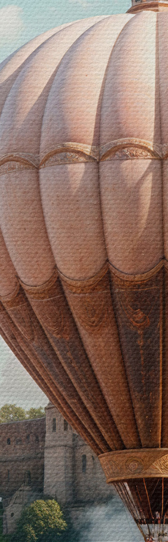 Schilderij Een fantasiekasteel omringd door roze heteluchtballonnen die in een bewolkte hemel boven een weelderig, groen landschap zweven Art. s39387