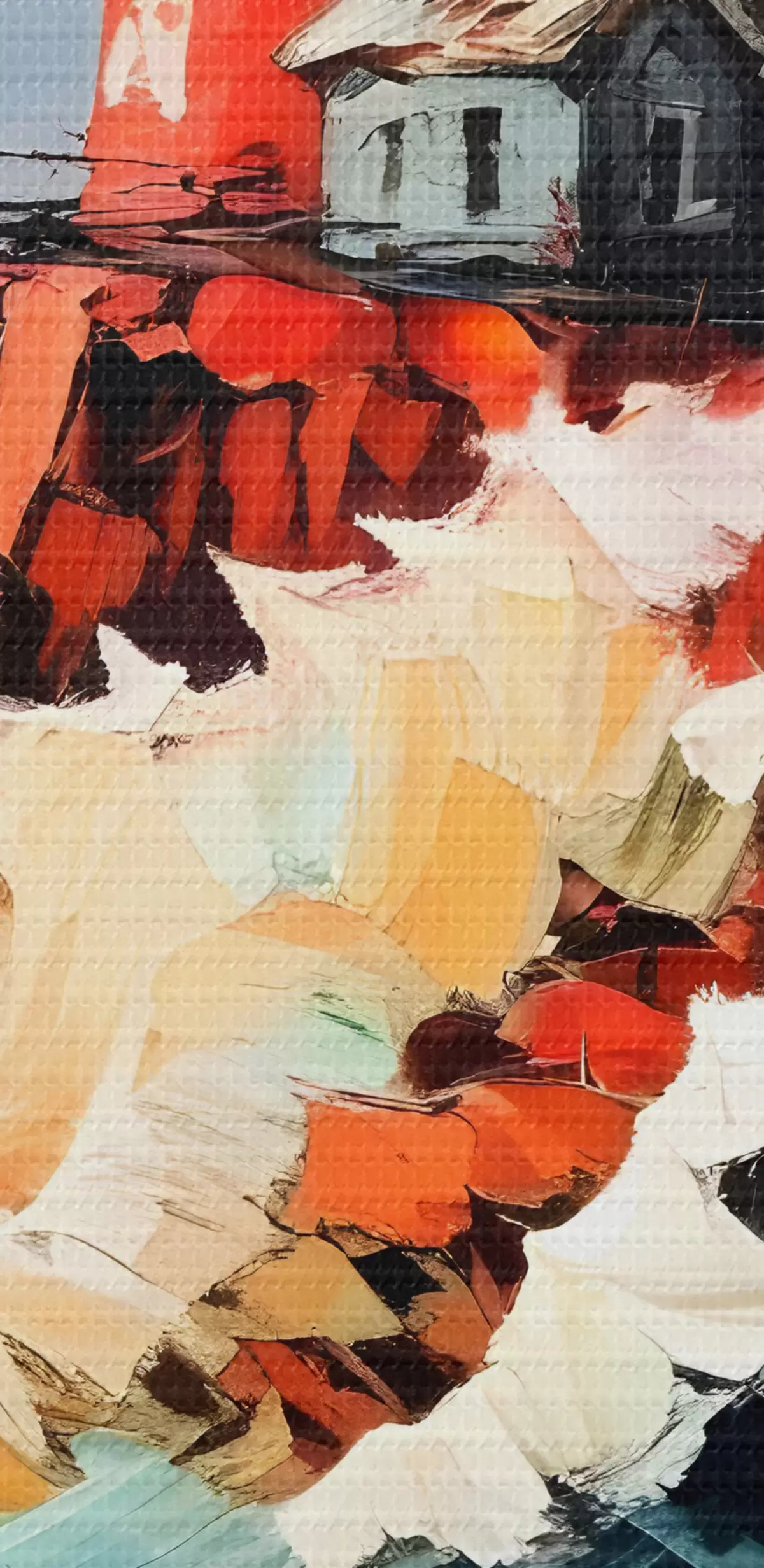 Schilderij Schilderij van een rode vuurtoren die hoog op een rotsachtige klif staat, omringd door beukende golven en een stormachtige lucht Art. s39392
