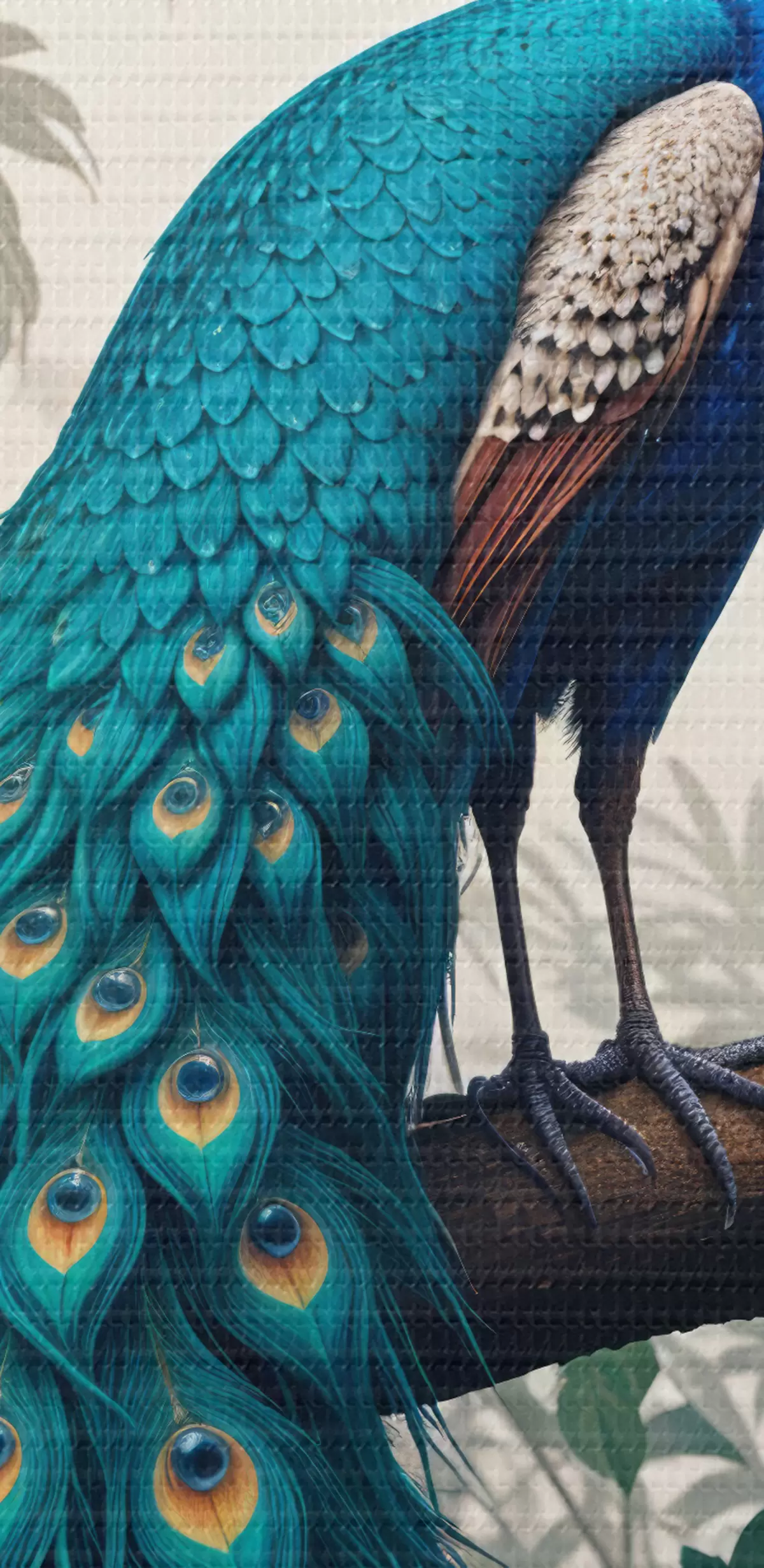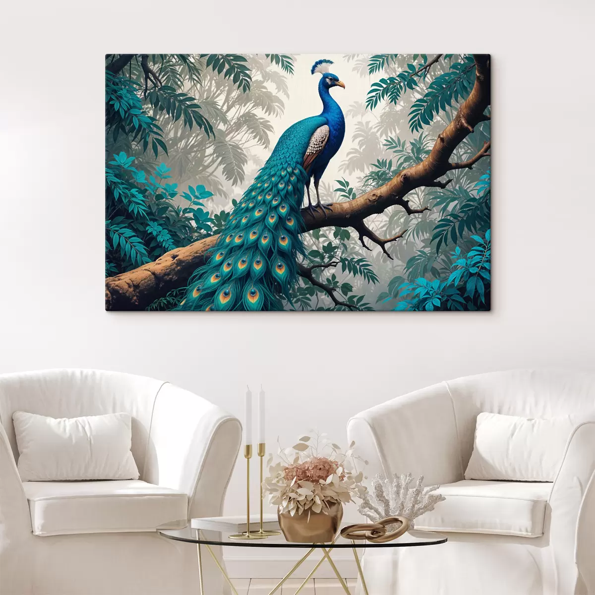 Schilderij Een levendige blauwe pauw op een boomtak in een weelderig, tropisch bos Art. s39401