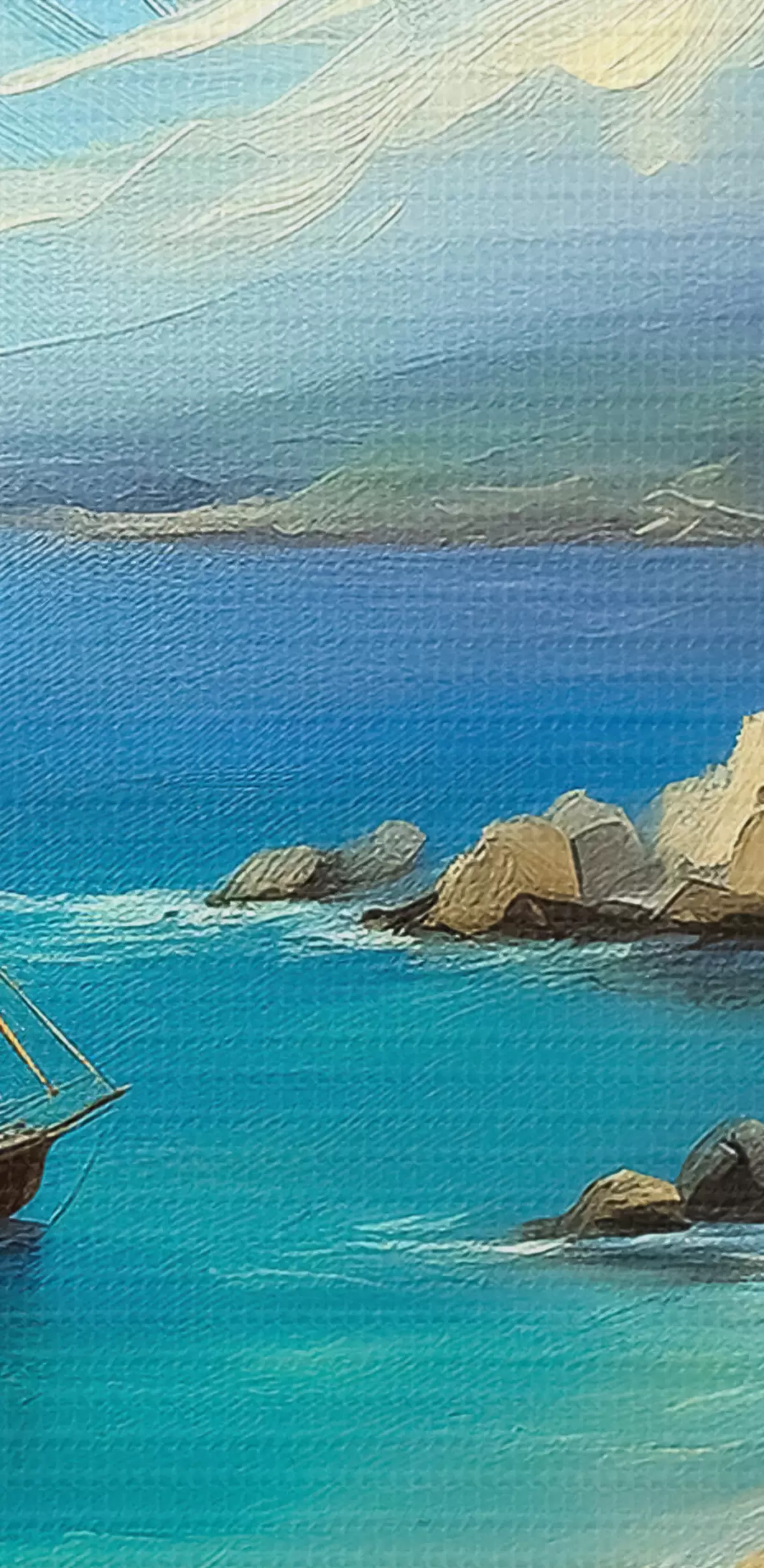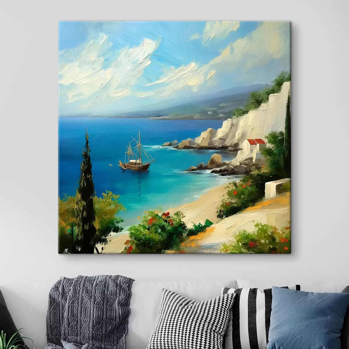 Schilderijen Zeekust van Griekenland, schip, blauw water, olieverfschilderij, zomernatuur, rotsen, levendige penseelstreken s39425