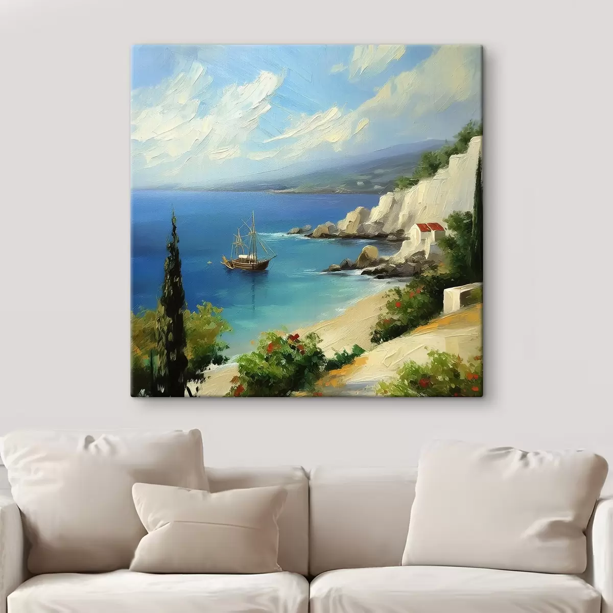 Schilderij Zeekust van Griekenland, schip, blauw water, olieverfschilderij, zomernatuur, rotsen, levendige penseelstreken Art. s39425