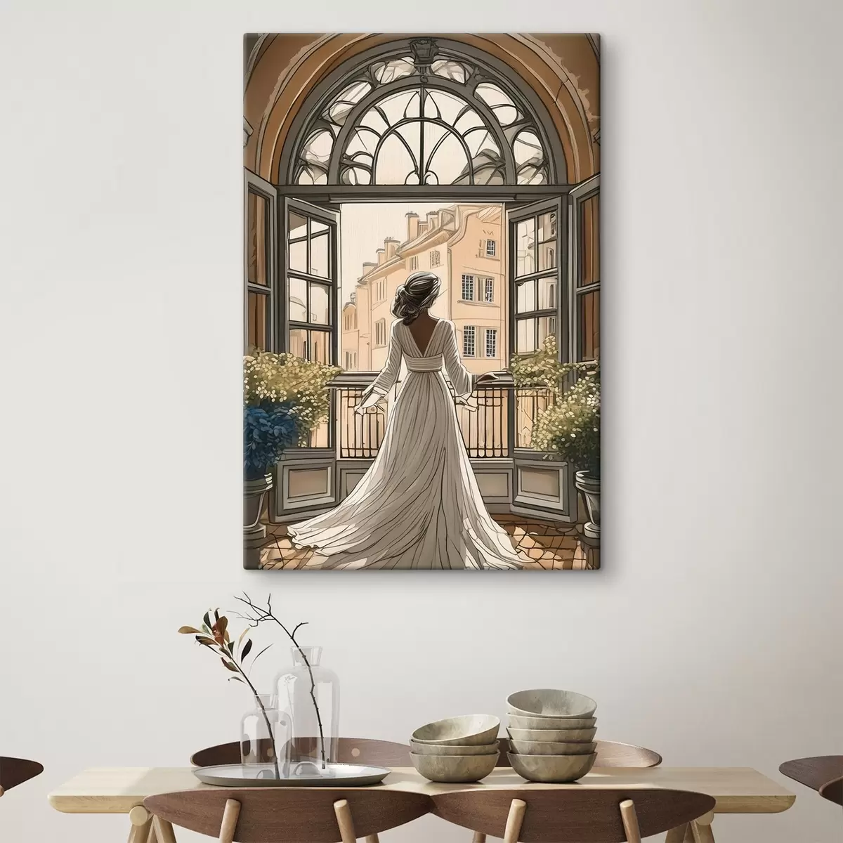 Schilderij silhouet van een meisje in een witte jurk bij een groot raam Art. s39480