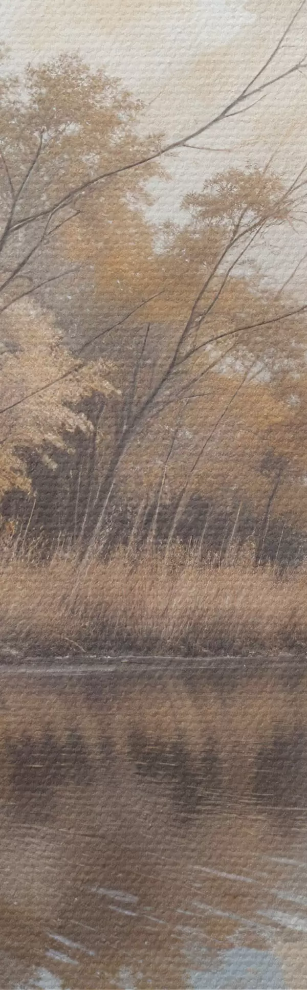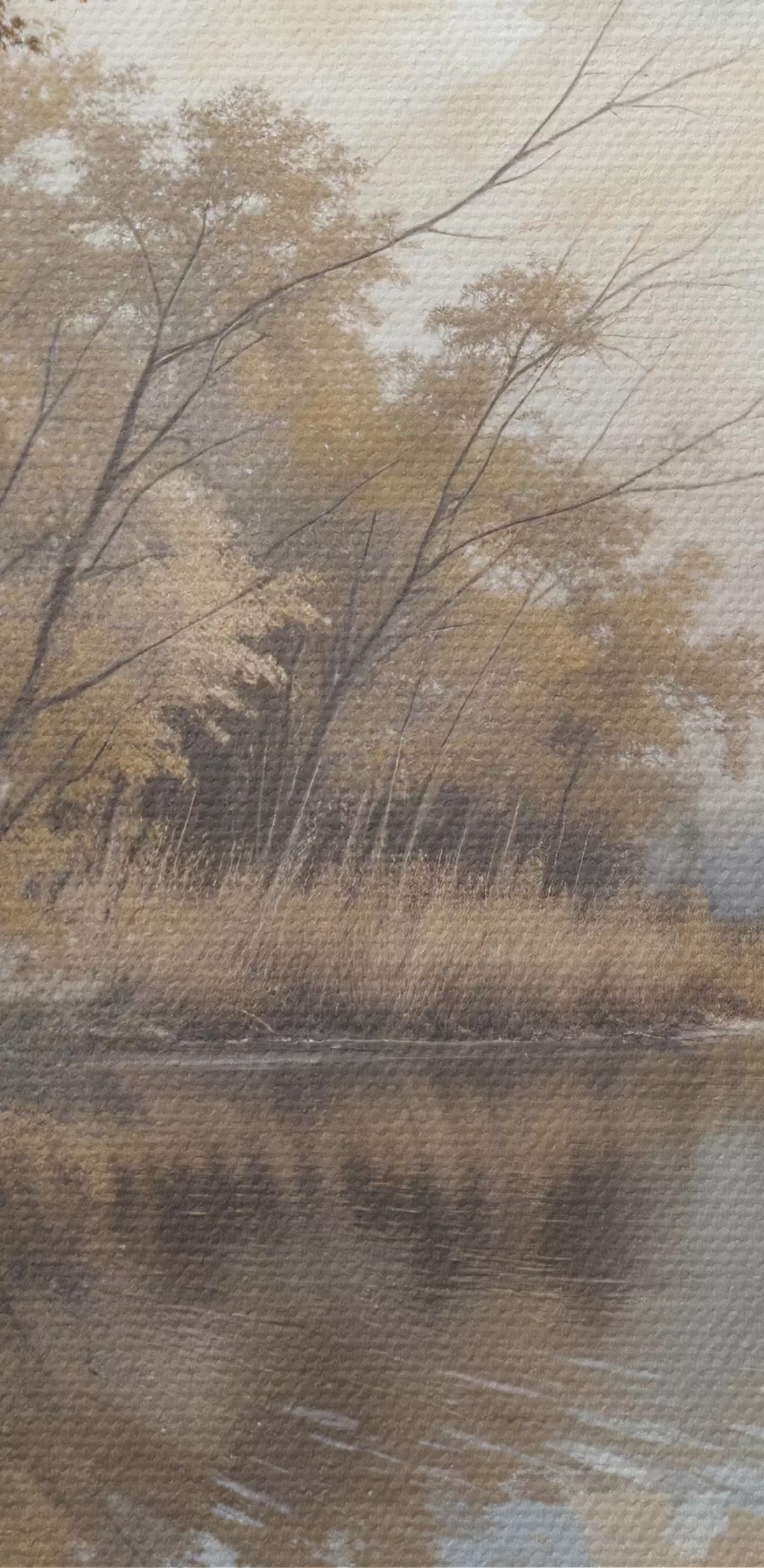 Schilderij Herfstlandschap met een rustig meer omgeven door bomen met levendig oranje en geel blad Art. s39511