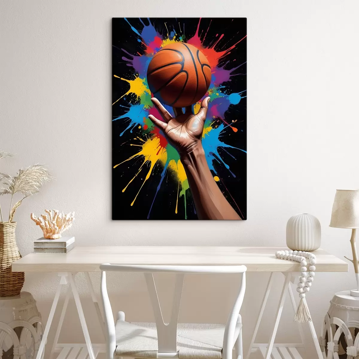 Schilderij Een hand die een basketbal vasthoudt tegen een kleurrijke splatterverfachtergrond Art. s39529