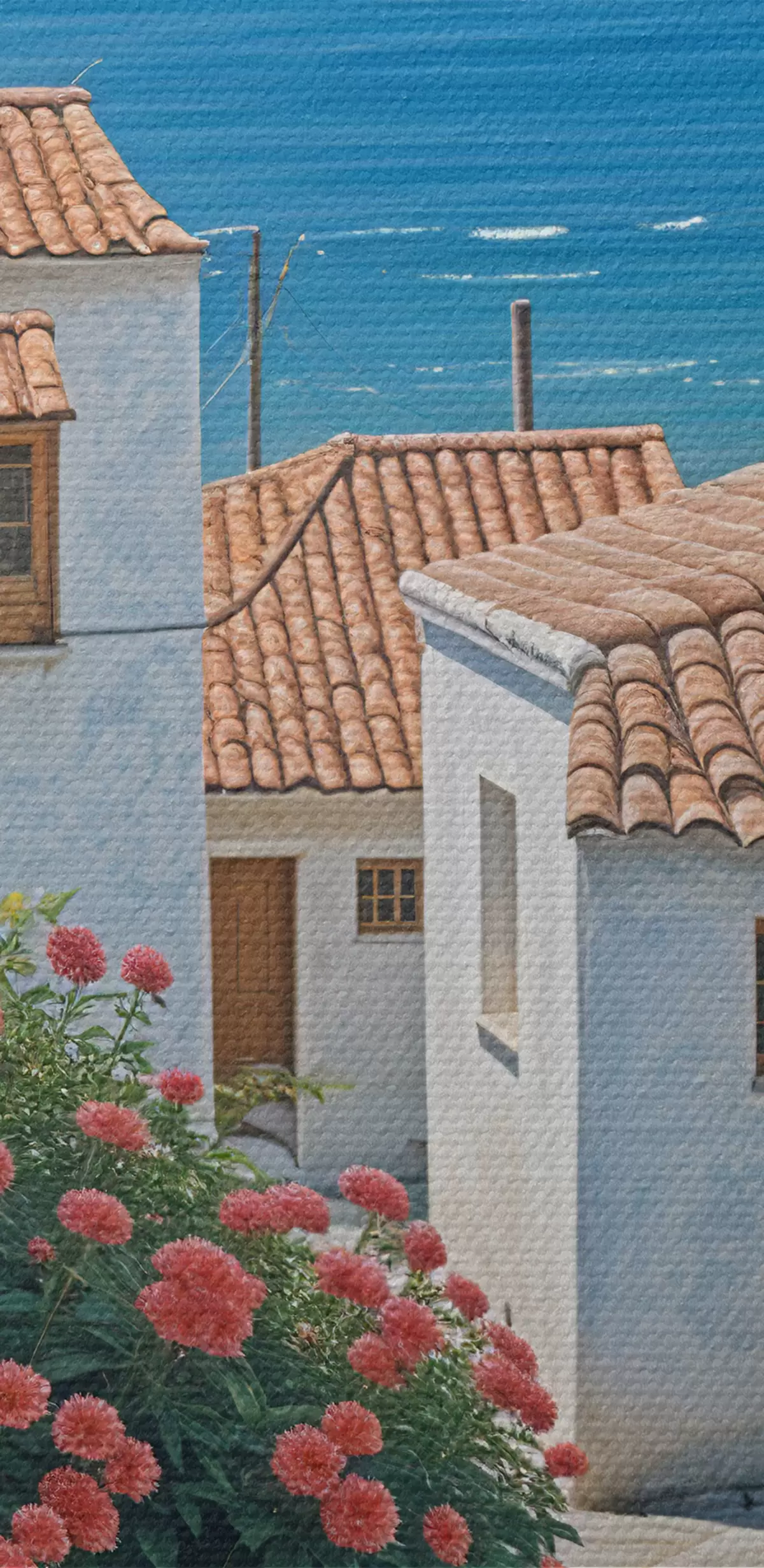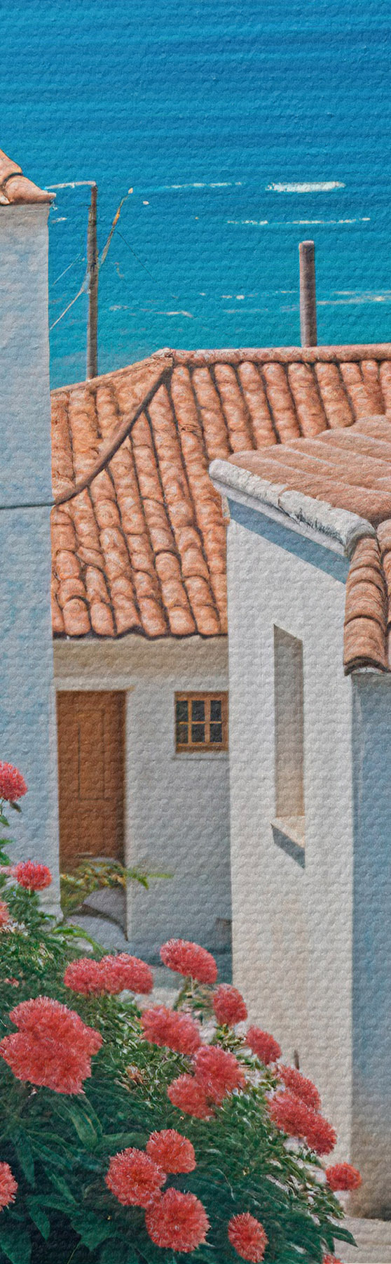 Schilderij Een smal straatje in een kustplaats, met witte gebouwen, rode pannendaken en levendige roze bloemen Art. s39532