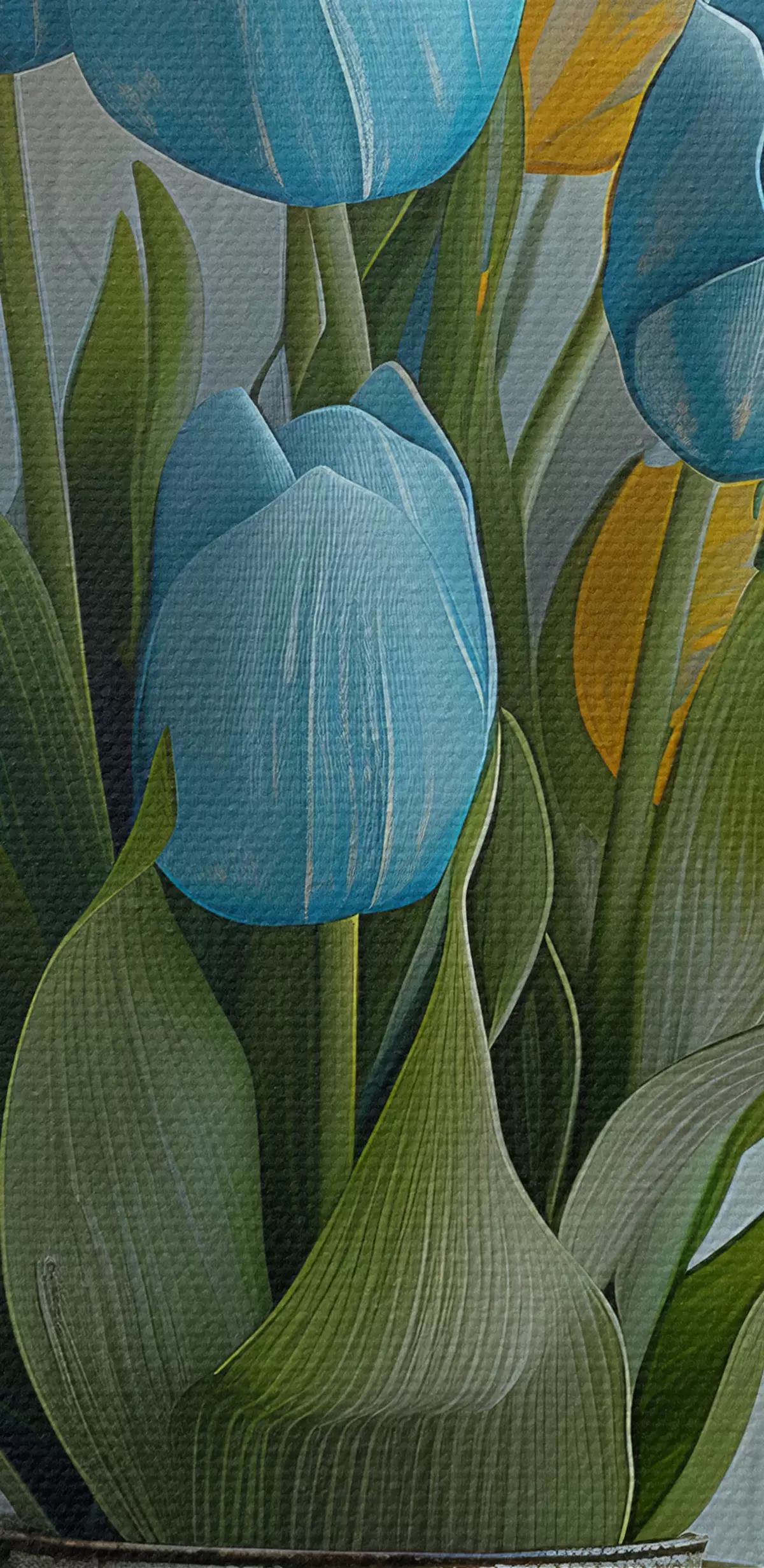 Schilderij Blauwe en gele tulpen in 3D: elegante wandfoto met witte lijst, witte en lichtblauwe achtergrond en gegraveerde vaas Art. s39636