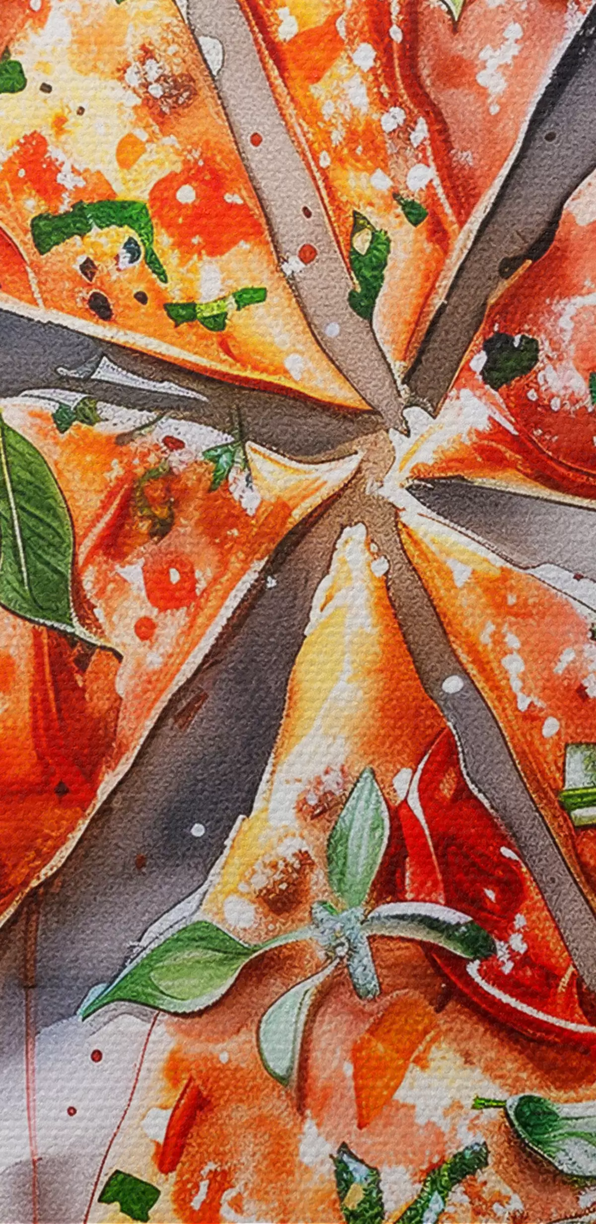 Schilderij Waterverfpizza, heerlijk, tomaten en kaas, voedselkunst, houten tafel Art. s39704