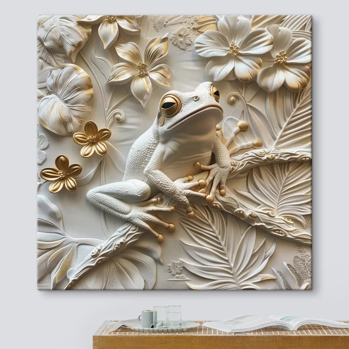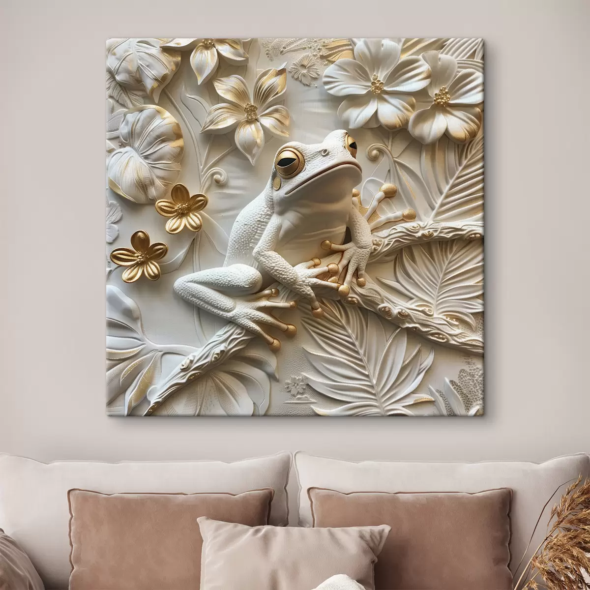 Schilderij Sculptuur met boomkikker en bloemenaccenten Art. s39751
