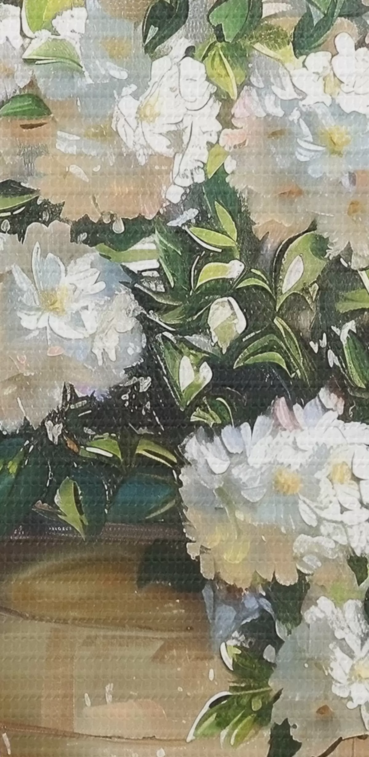 Schilderij Witte hortensia's in de vaas, zonlicht in het raam, olieverfschilderij Art. s39779