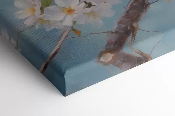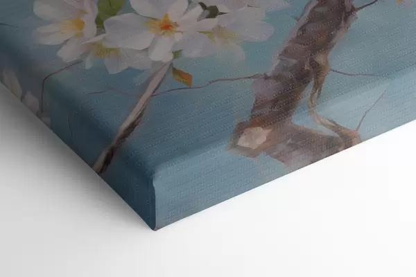 Schilderij Mussen zittend op een bloeiend takolieverfschilderij, blauw, wit, bruin Art. s39829