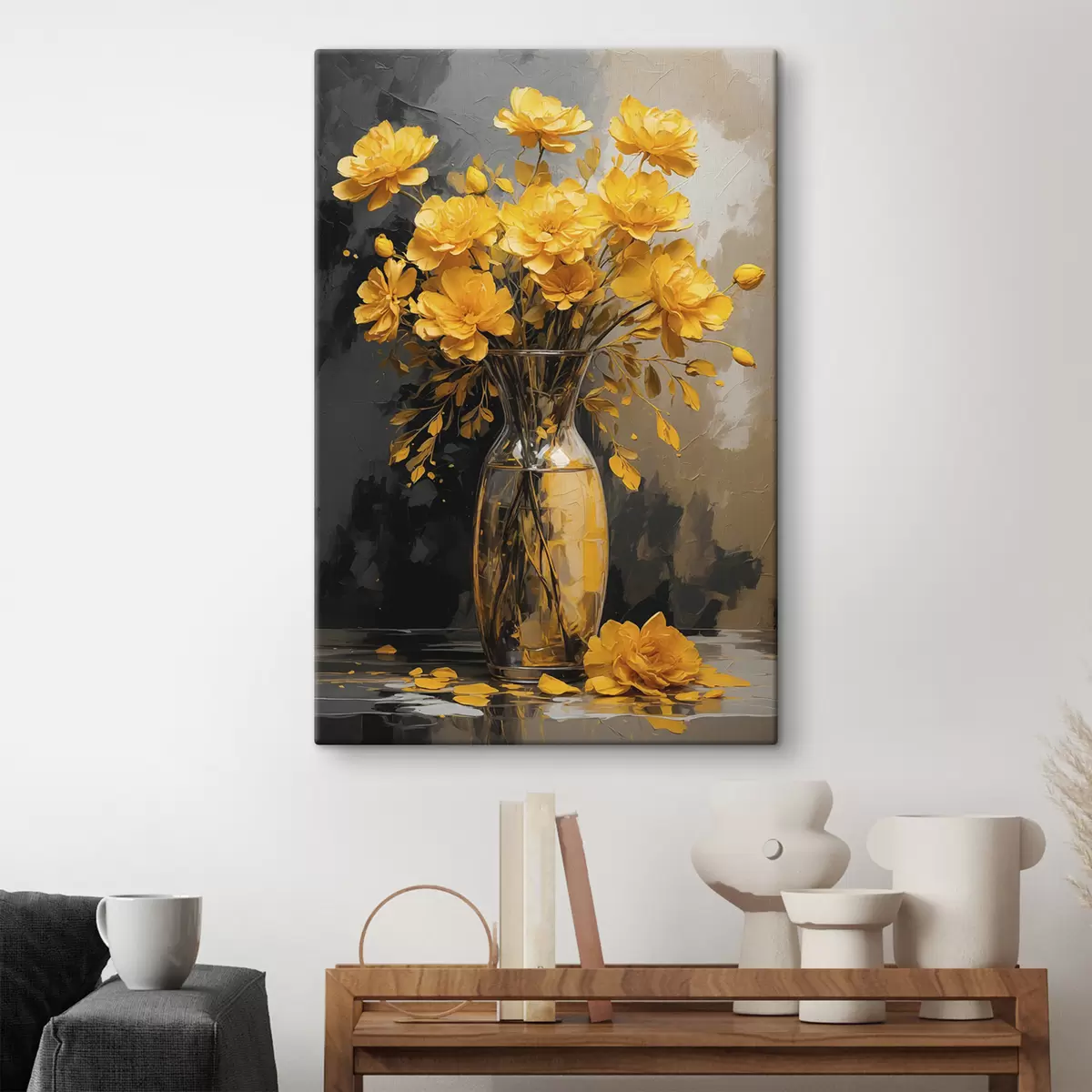 Schilderij Gele bloemen in transparante vaas op acrylachtergrond Art. s39853