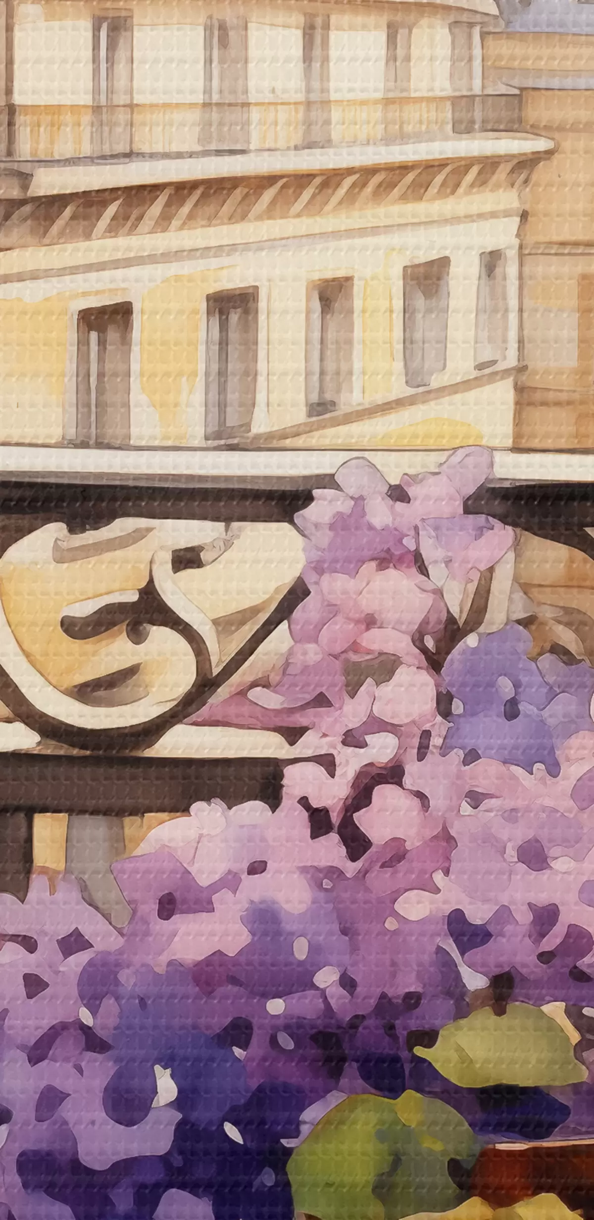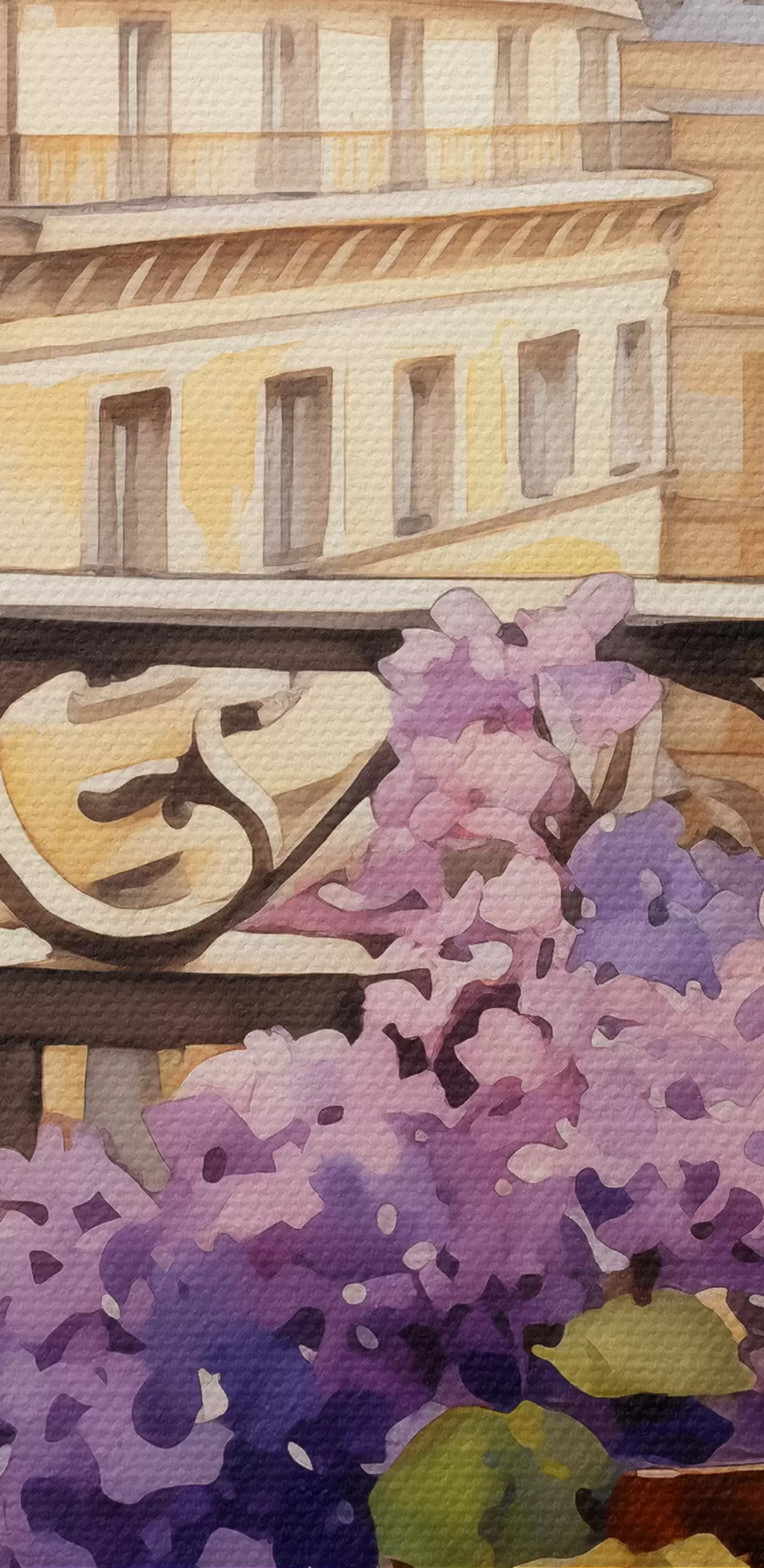 Schilderij Viooltjes in een pot op een balkon in Parijs aquarel Art. s39931