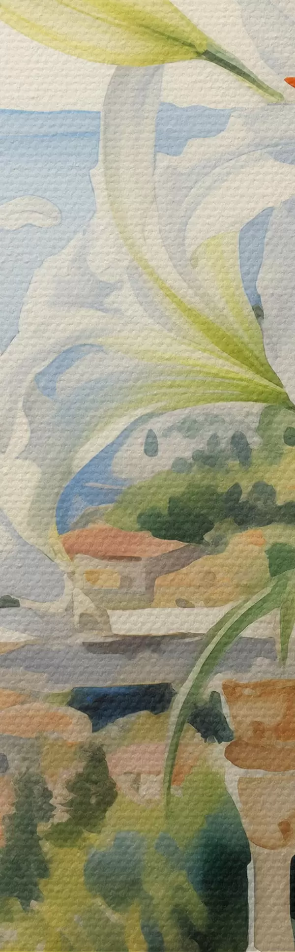Schilderijen Witte lelies in een pot op een balkon tegen de achtergrond van de baai aquarel s39932