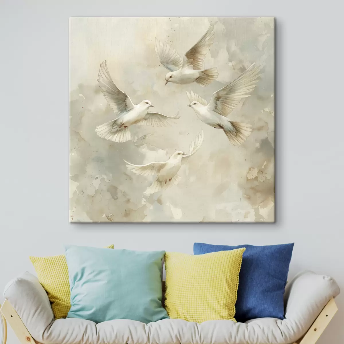 Schilderij Aquarel vliegende vogels, zachte beige en witte kleuren, duiven Art. s39976