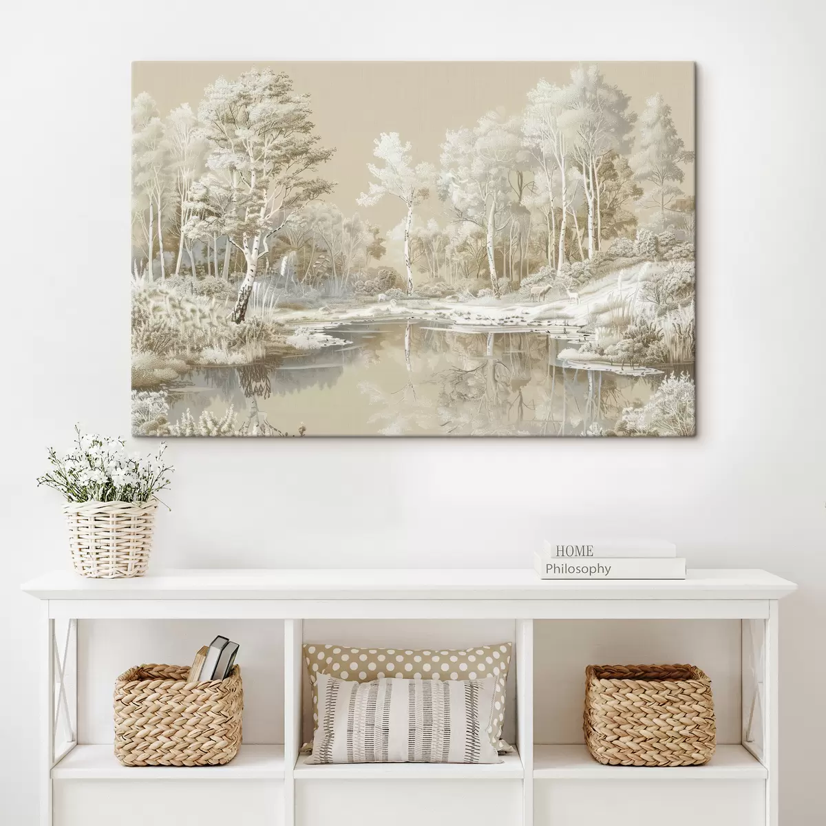 Schilderijen Prachtig boslandschap, vijver en bomen, beige en witte kleuren s39979