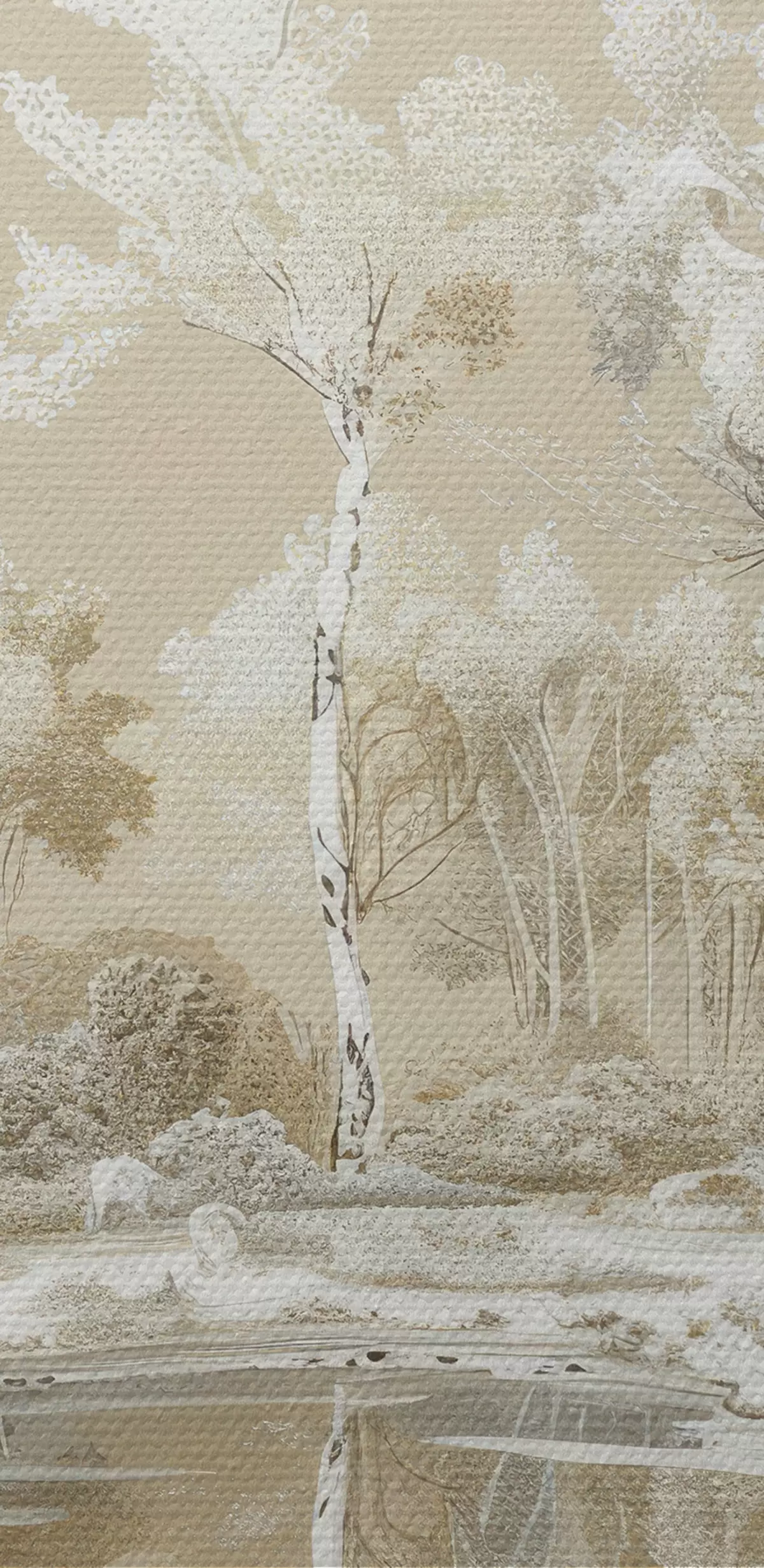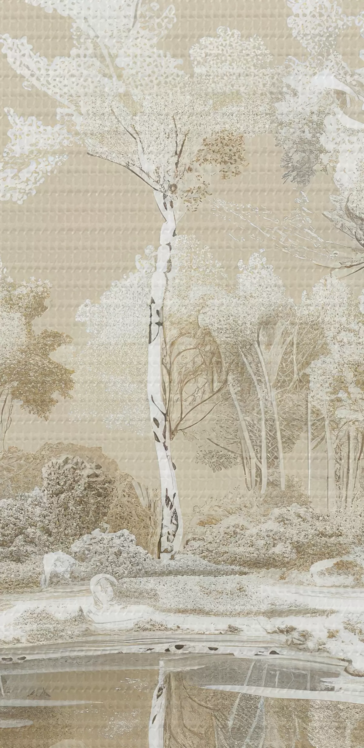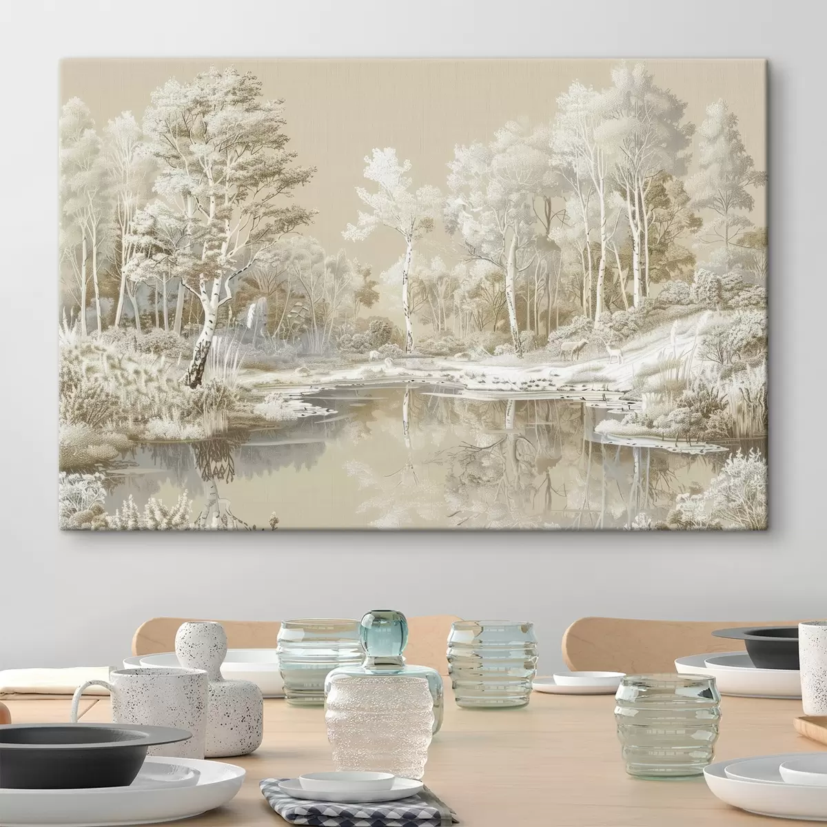Schilderij Prachtig boslandschap, vijver en bomen, beige en witte kleuren Art. s39979