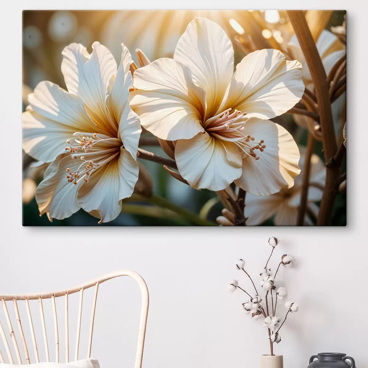 Schilderij Witte en oranje hibiscusbloemen in bloei, met zachte focusachtergrond Art. s40035