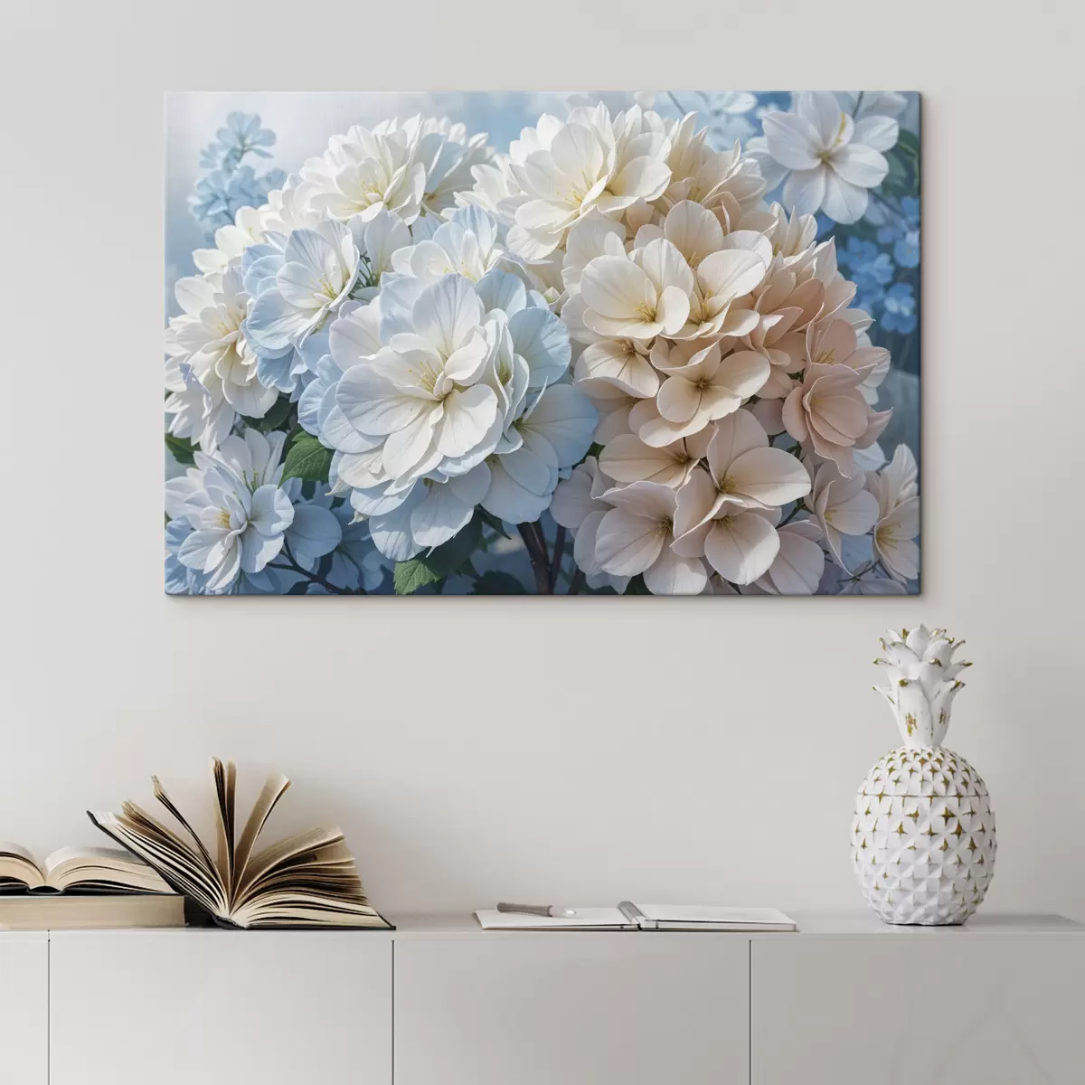 Schilderij Zachte, pastelkleurige dahliabloemen met delicate bloemblaadjes die bloeien tegen een wazige achtergrond Art. s40146