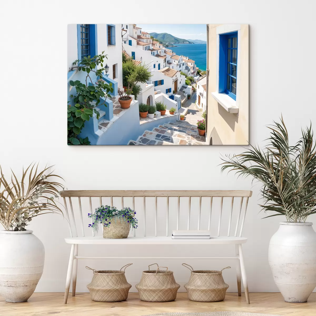 Schilderij Een pittoresk kustplaatsje met witte gebouwen, blauwe ramen en potplanten langs de smalle straatjes Art. s40148
