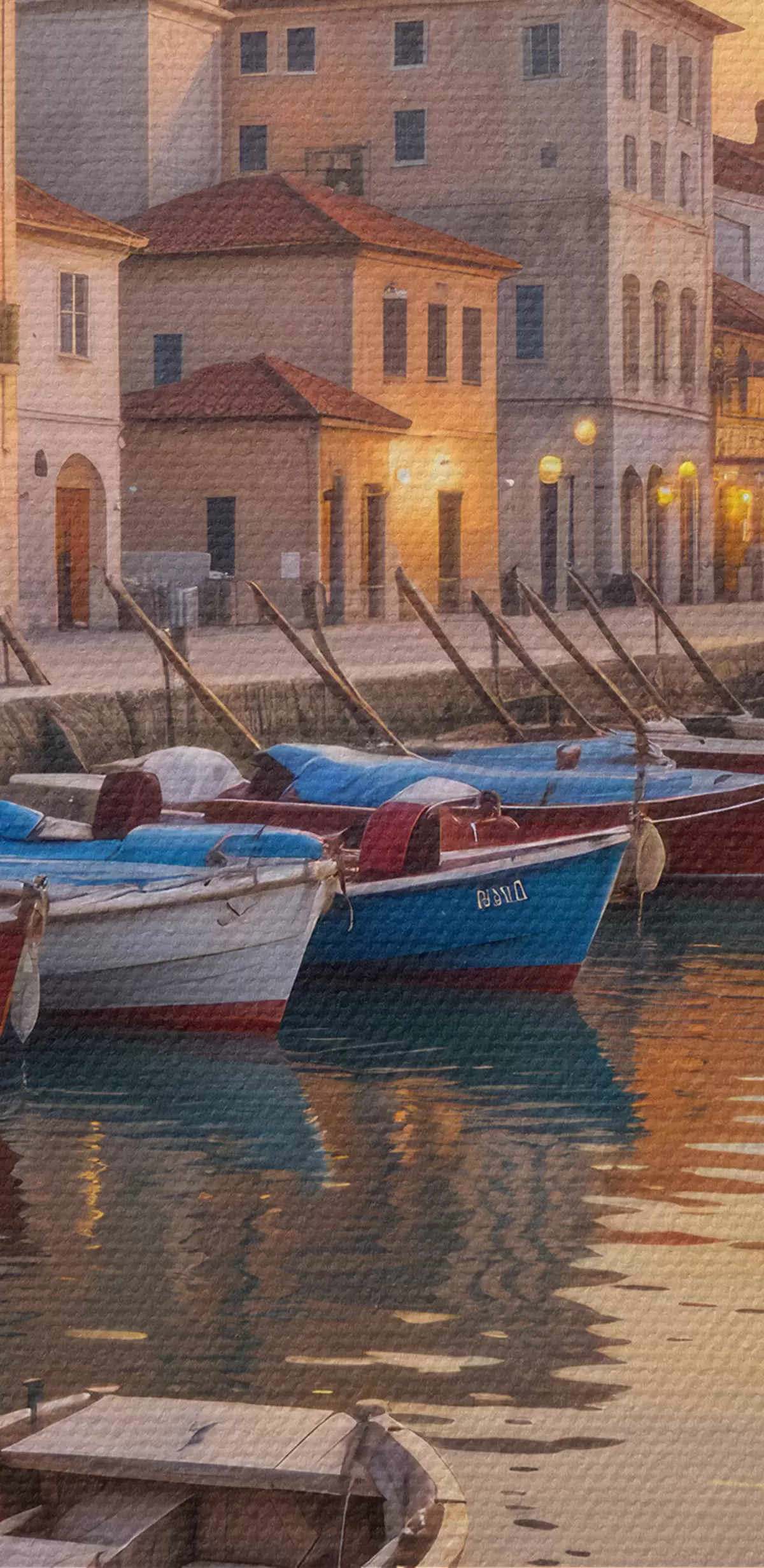 Schilderij Italiaanse kustplaats bij zonsondergang, met kleurrijke gebouwen langs de waterkant en boten die in het kalme water dobberen Art. s40150