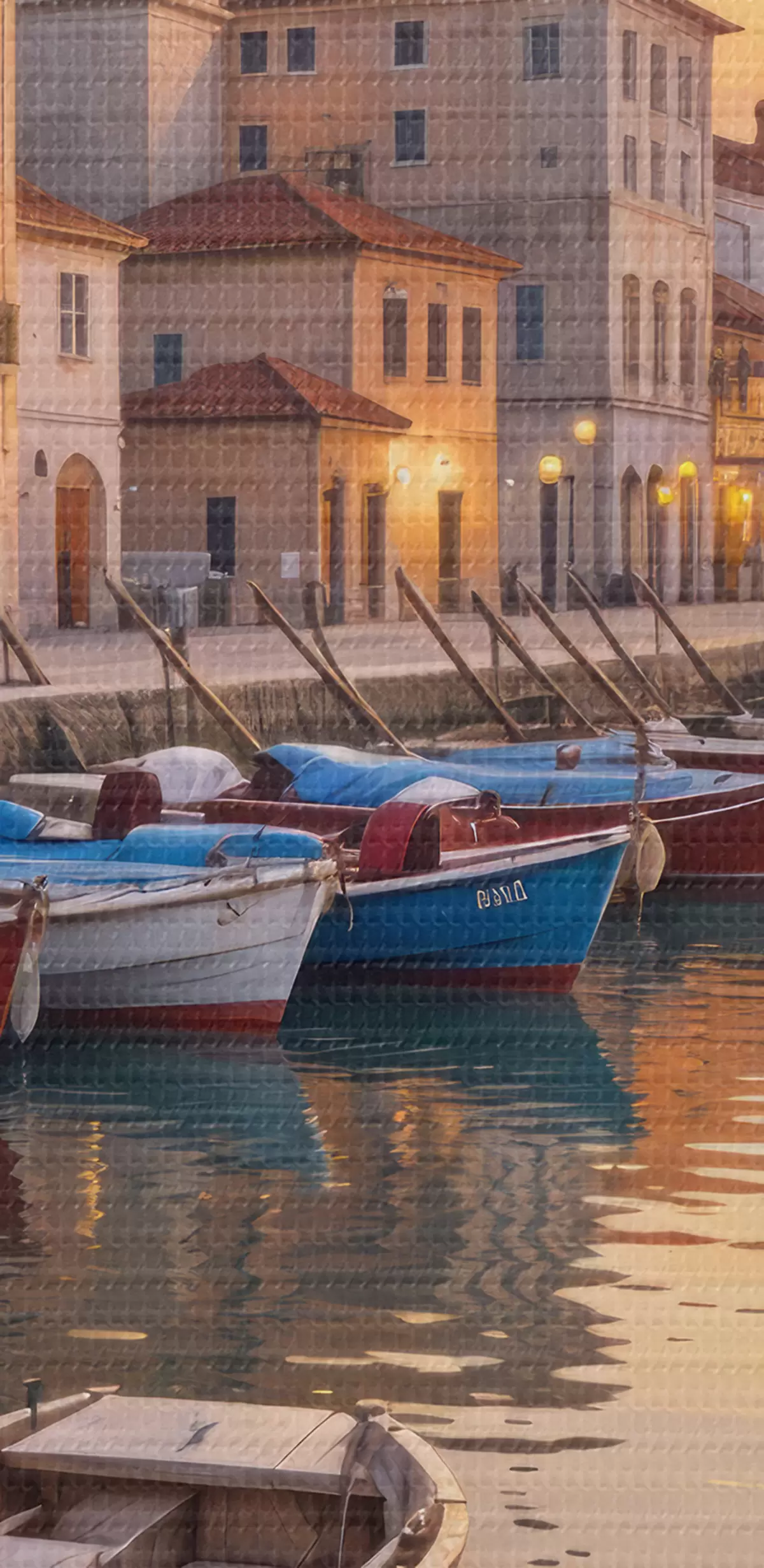 Schilderijen Italiaanse kustplaats bij zonsondergang, met kleurrijke gebouwen langs de waterkant en boten die in het kalme water dobberen s40150