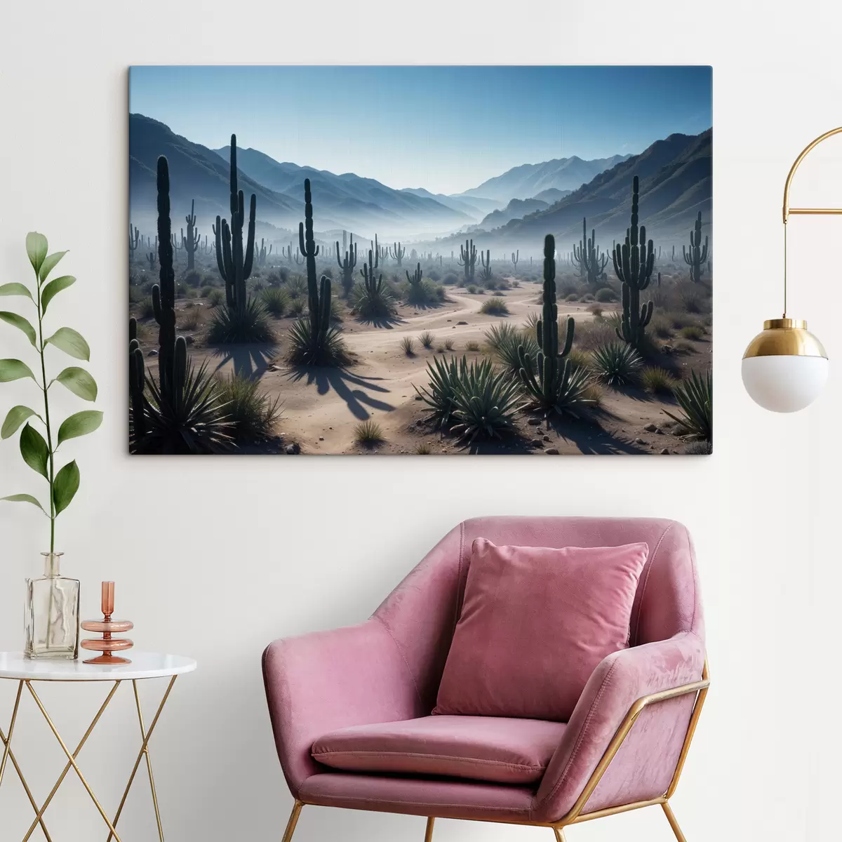 Schilderij Een woestijnlandschap met hoge cactussen en yuccaplanten op de voorgrond, omgeven door wazige bergen Art. s40153