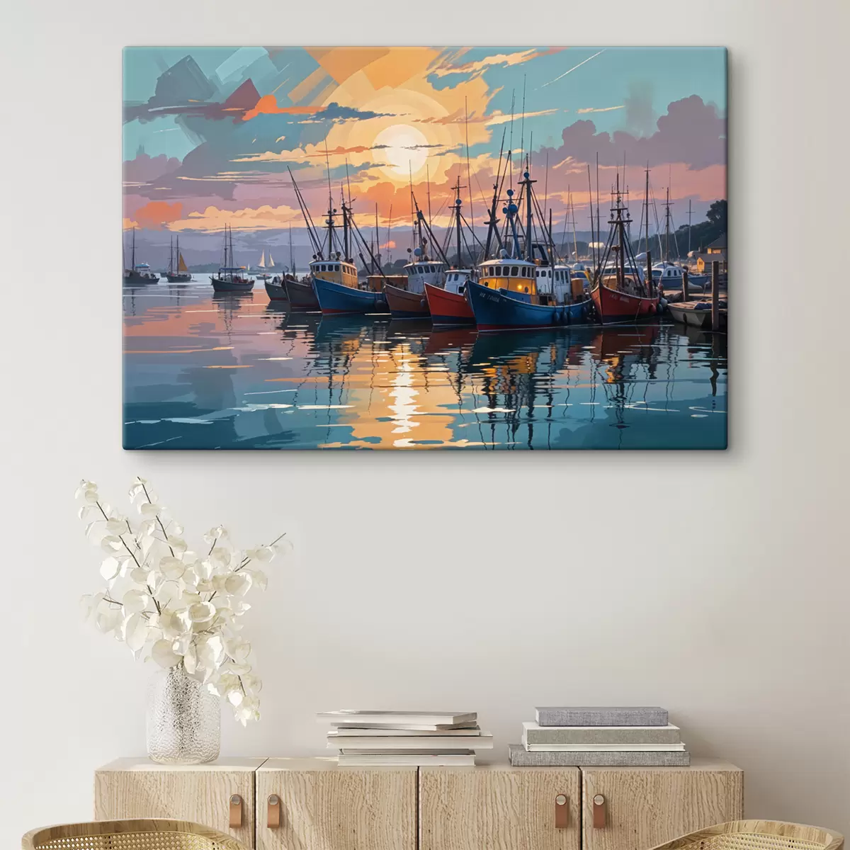 Schilderij Een kleurrijke zonsondergang boven een haven vol vissersboten en schepen, wat een sereen en pittoresk tafereel creëert Art. s40158