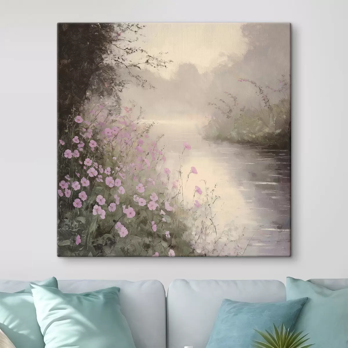 Schilderij Meer met roze bloemen, zonsopgang, olieverftekening, pastelbeige kleuren, mist Art. s40229
