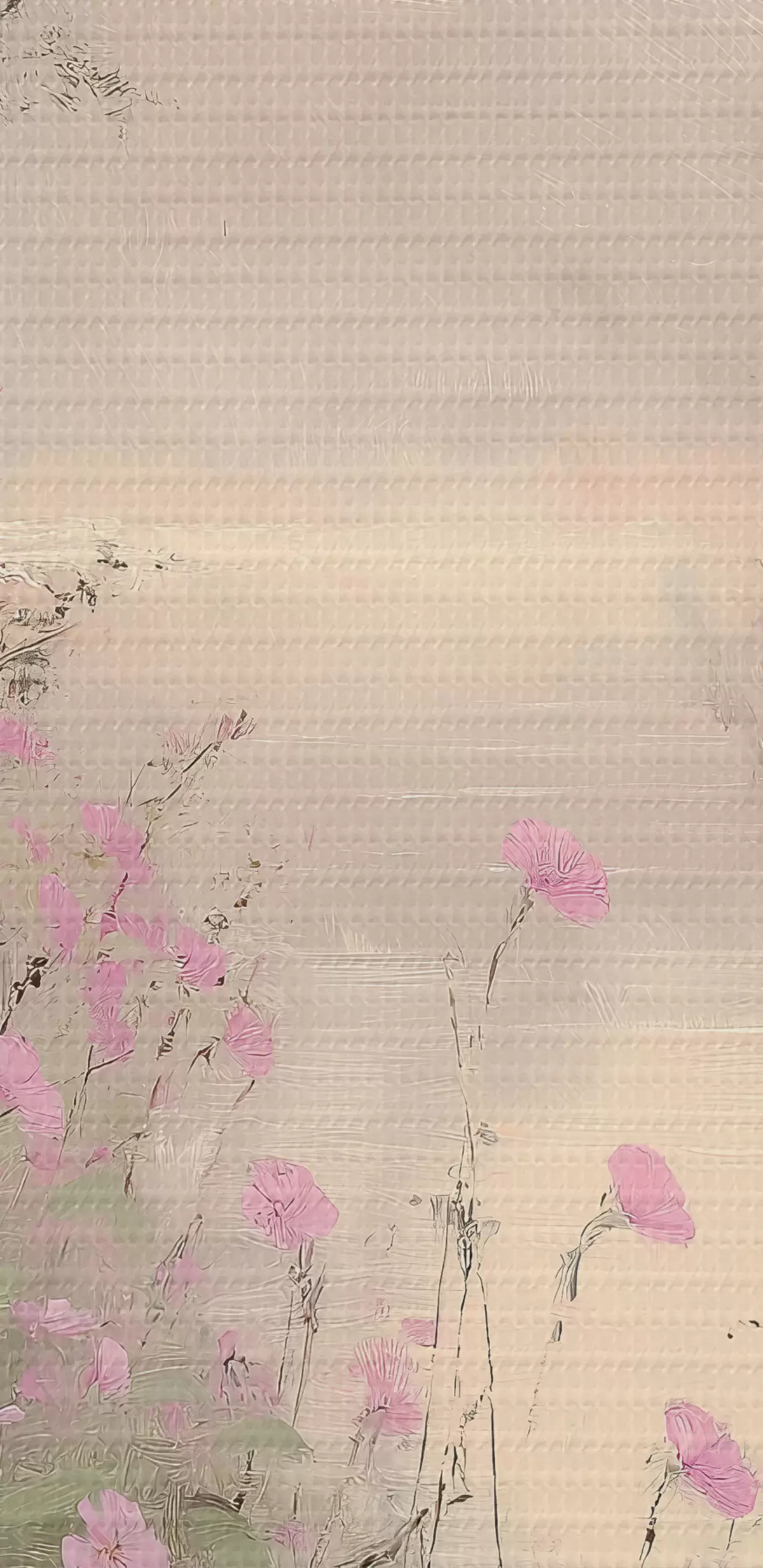 Schilderijen Meer met roze bloemen, zonsopgang, olieverftekening, pastelbeige kleuren, mist s40229