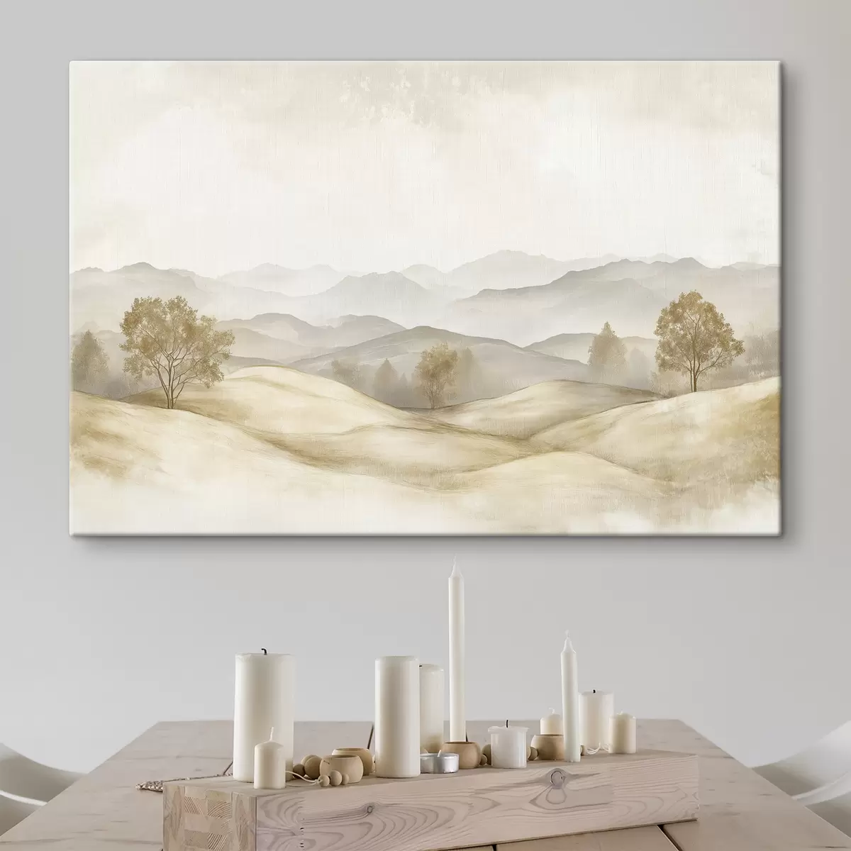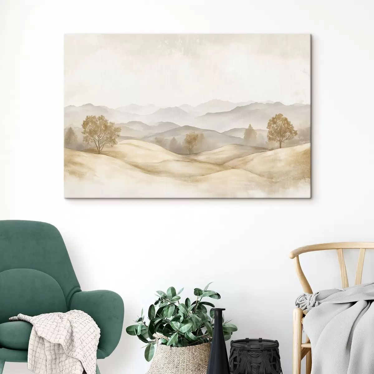 Schilderijen Natuurlandschap in beige kleurenpalet, weide, bomen, aquareltekening s40231